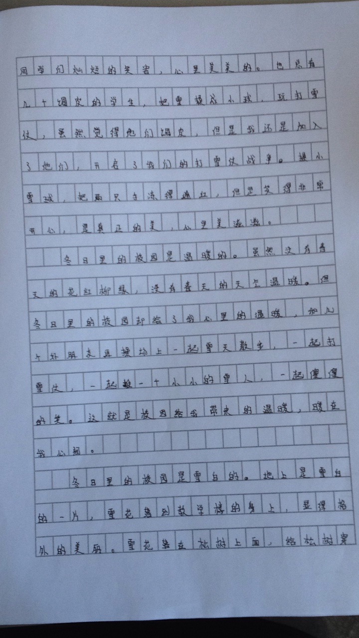 冬日里的校园是温暖的。虽然没有春天的花红柳绿,没有春天的天气温暖。但是冬日里的校园却给了我心里的温暖。和几个好朋友在操场上一起雪天散步,一起打雪仗,一起堆一个小小的雪人,一起傻傻的笑,这就是校园给我带来的温暖,暖在我心间。