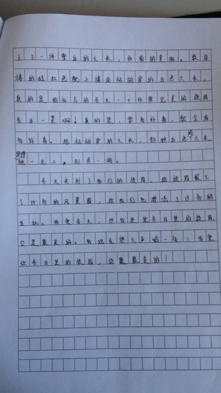 冬天来到了我们的校园,给校园留下了许多的风景图,给我们也增添了许多的生机,我爱冬天,但是我更爱冬日里的校园,她是最美的。我现在想大声喊:一句我爱你。冬日里的校园你是最美的。