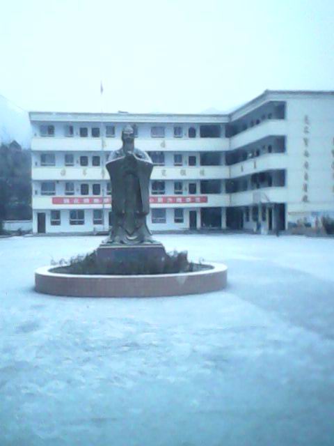 纷纷扬扬的大雪撒向了校园,落在了高大的教学楼上,落在了实验楼前整齐且高大的水杉树上,落到了圣人孔子像上,落到了花坛的翠竹上,落到了葱茏的雪松上,落到了塑胶操场上,把整个校园装点的美轮美奂。