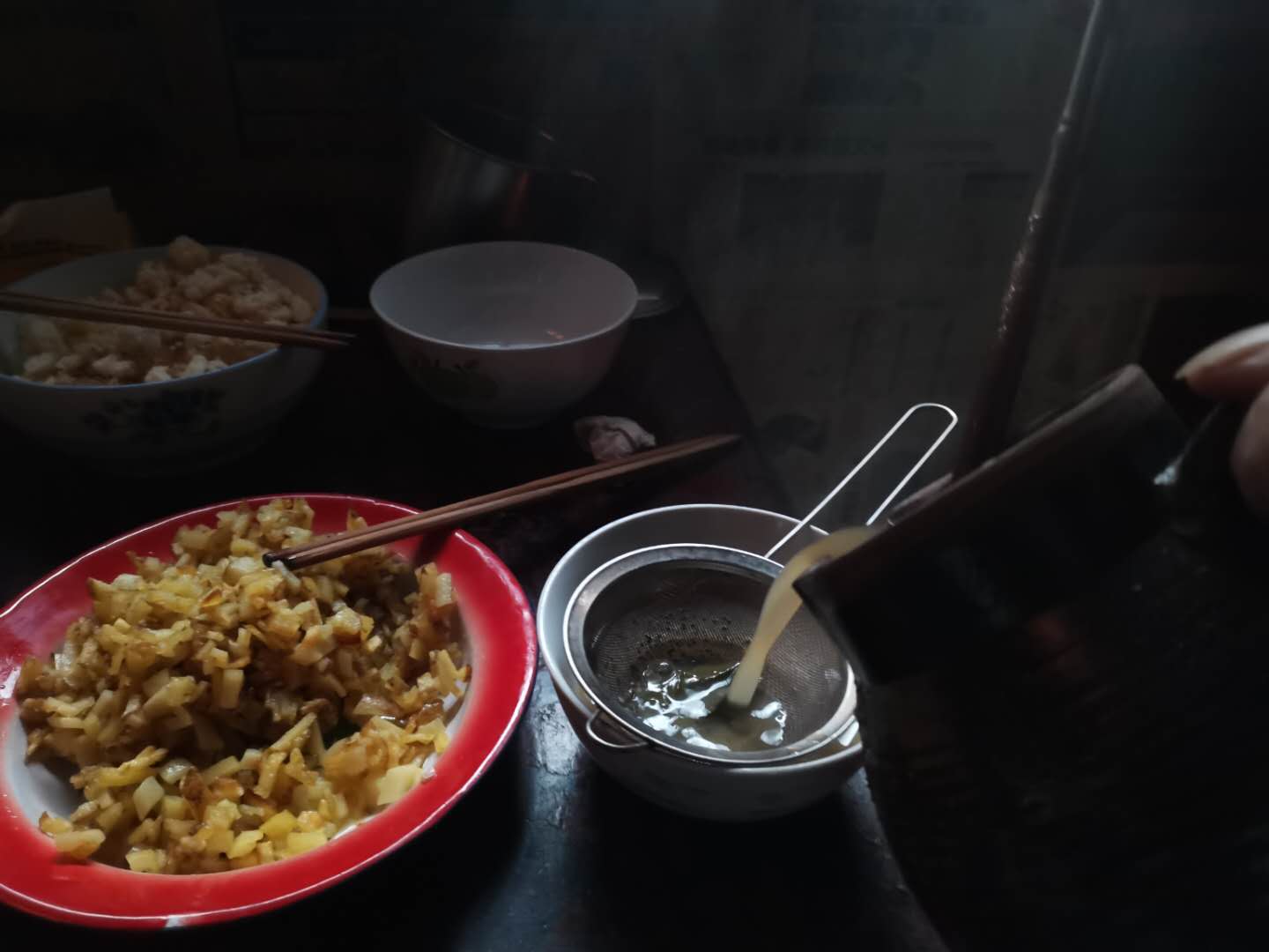 先把茶叶放在茶罐里,再放开水,还要放盐,等水开的过程中,将面粉用水化成面糊,一点一点的倒在茶罐里,等煮开后,一碗香喷喷的罐罐茶就完成了一半了。倒茶的时候拿一个小网子把茶叶过滤一下,再调一些炒好的土豆或者鸡蛋什么的,一碗香喷喷的罐罐茶就好了。