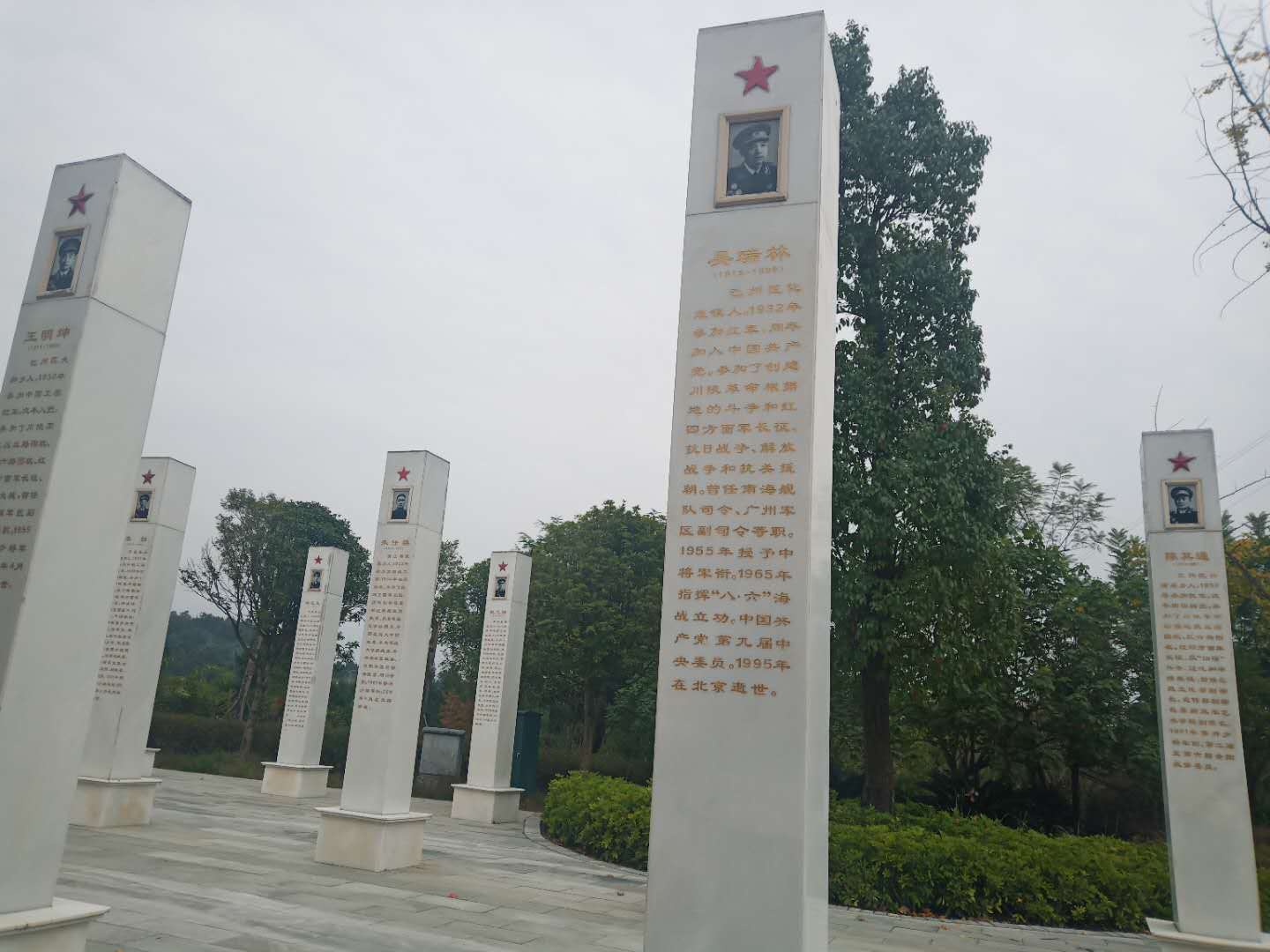 这我最期待的地方-将军柱阵,共有27根石柱,代表了27位从巴中走出的共和国将军站在我面前,就像那一位位将军站在我面前,我看着上面刻着的关于将军的信息,我感觉我已经撤底的了解了将军。他们从小就有一颗当红军的心,当红军的梦想,他们无私奉献,不怕生死,努力地为共产党争回更好的明天。 一根根石柱就像一位位活化石站在我们的面前,鼓励着我们,永不放弃,向他们一样学习,生活。