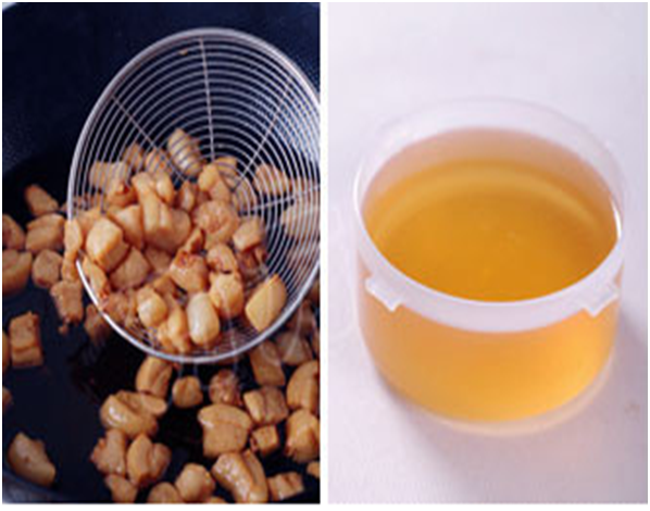 熬1小时左右,肉丁缩成很小块,微黄即可,不可熬过了。全程都是小火,避免火太大了油渣变焦而破坏了油的味道和成份,整个过程不用盖盖,只在开始油少时稍微搅拌几次,避免受热不均匀。捞出油渣,油彻底冷却后倒入容器中密封冷藏保存(注意不要把锅底的碎渣倒入)。