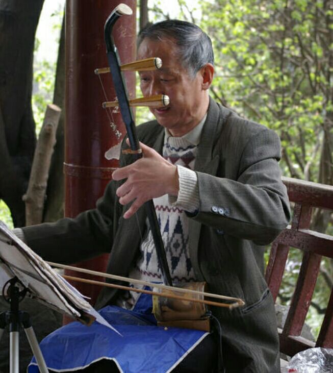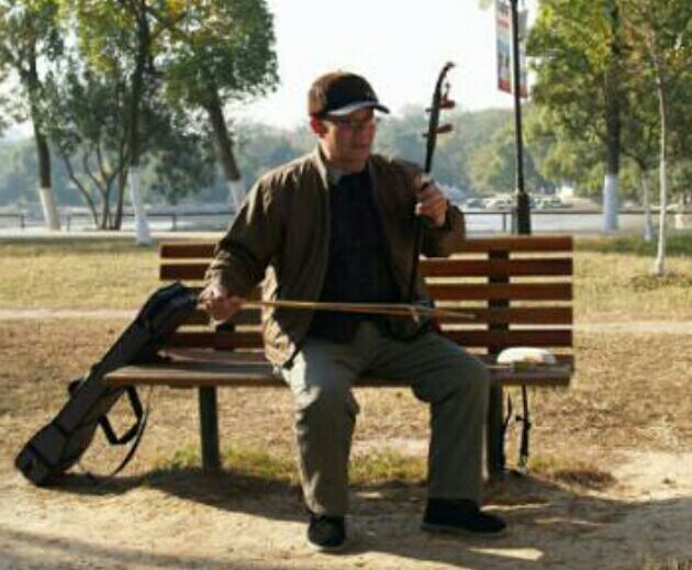 老人的膝盖上放着一把已经有些褪色的二胡。 像老树皮的右手持着胡弓机械的拉动着,手背上横七竖八爬满一条条血管的手,似乎已饱经风霜。老人的手时上时下的按着琴弦,有一些不知名的曲子反反复复的从二胡里传出,弓弦上不时飘散出淡淡的白色粉末。