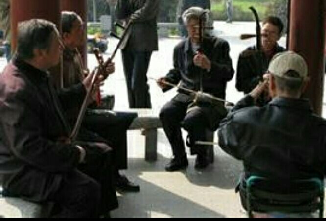 其中有一位老人带着一顶草帽,那个草帽似乎不是很新,给人一种碰了就会散了的感觉,草帽中心又圆又高,似乎非常有意的遮住了二胡老人的半张脸 。我只能隐隐约约的看见他那黑白交错的胡子扎满整个下巴,看上去又粗又硬。他上身穿着一件黑色的运动衣,下身穿着一条黑色的裤子,裤子像被染了色一样,一处黑,一处紫,一处蓝,脚上穿有一双该“退休”的黑布鞋。