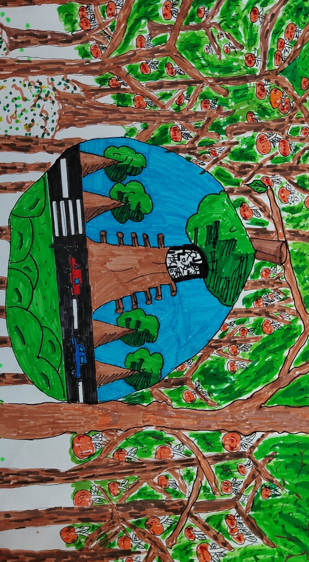 每一个橘子都住着人类,每一个橘子都是人类的家园。而在现实生活中,人们为了自己的利益,在每一个橘子上都喷洒了很多农药。比如催熟剂、甜蜜素等等,这些都会损害我们的身体。所以我就在每一个橘子上都安装了一个农药吸收器,它能吸收一切会对我们人体产生危害的农药,让我们的环境、空气质量更清新,更美好。