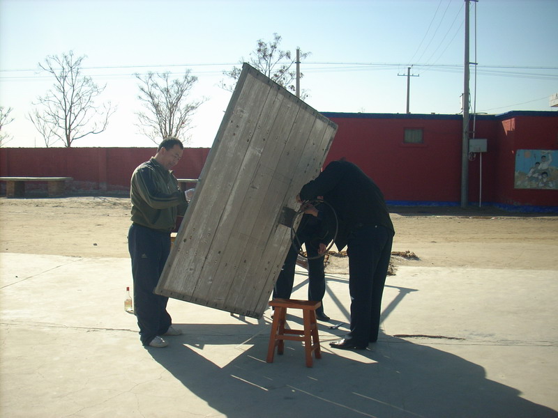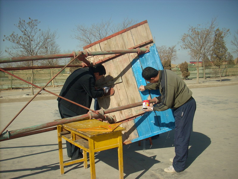 所有损坏的零件被更换完以后,下面的任务就是油漆了,他们一手提着油漆桶,一手拿着刷子,在篮球板上推来推去,比专业人员水平也差不了多少,看到他们脸上的笑容,好像在说,我们的劳动终于有了成果,看新篮球板,多漂亮。