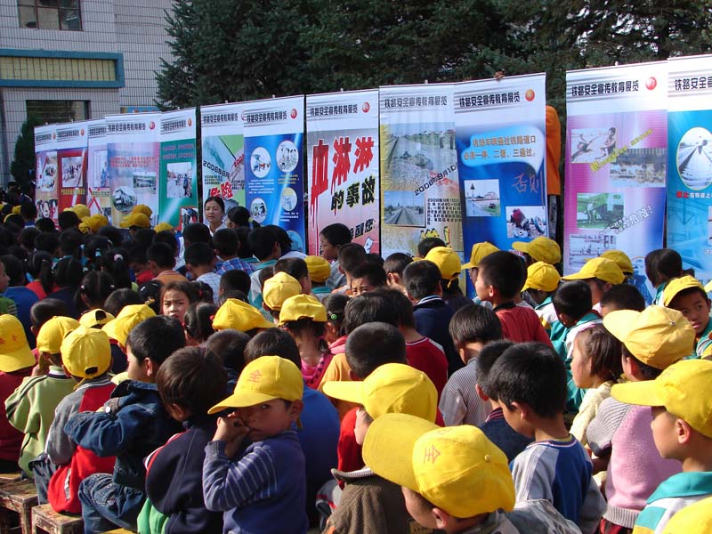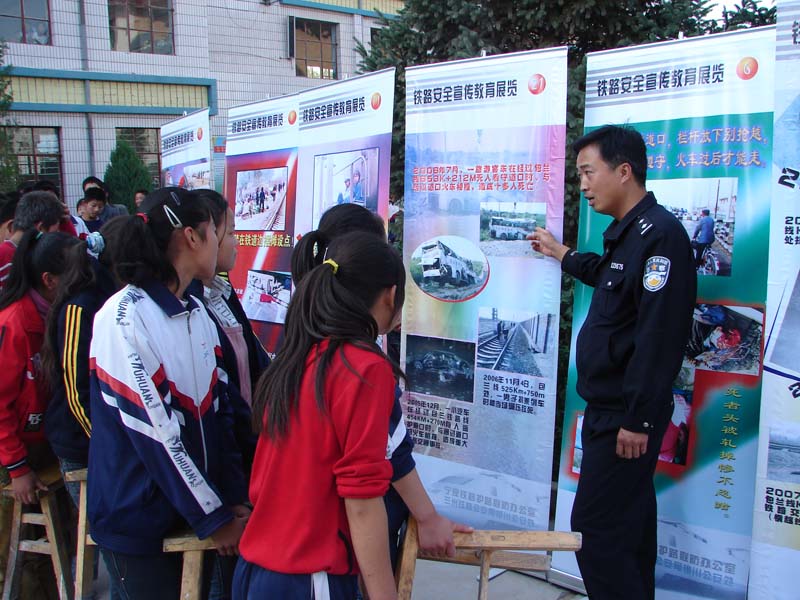 在会场的两旁,立着二十六张关于铁道安全指示牌和一些阴森森的安全事故照片,让人看着都恐惧,幸好是在白天,而且人比较多,要不真给吓趴下了。