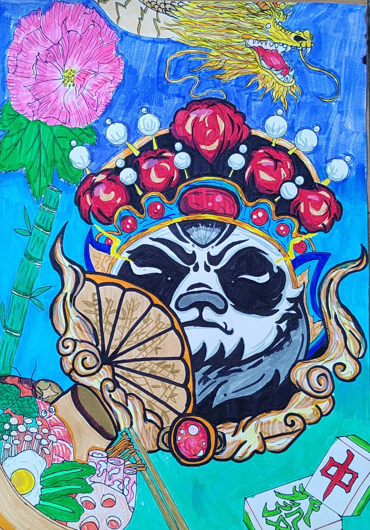 图画以眼神充满了威严、霸气的熊猫为主题,右下角是成都人民主要休闲娱乐工具——麻将,左下角是四川最为出名的特色美味——火锅,最上面有一条威风凛凛的金龙,代表今年上龙年。整副图代表着全成都人民龙行千里,龙行龘龘!