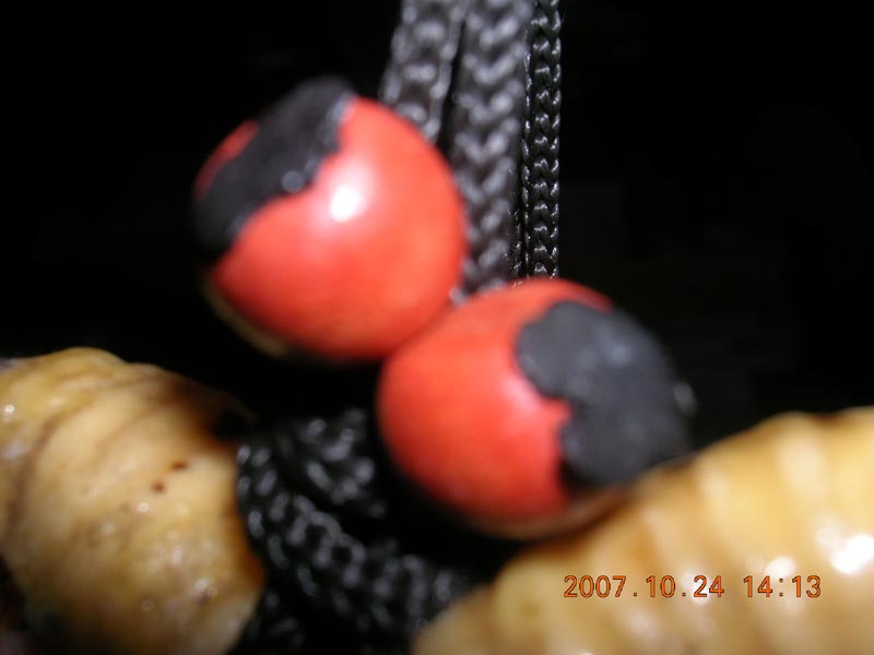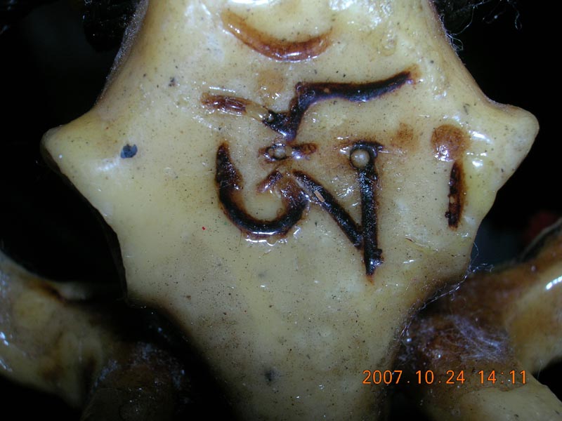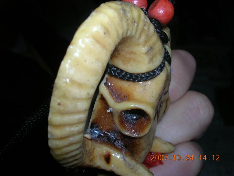 它的脸上还有一个地方值得人思索,你观擦到了吗?就是它的额头上写了一个字,不知道是什麽甲骨文,反正我看不懂,帮个忙吧,此外,它的两角的最根部栓着一条黑色神子,方便挂在房间里做装饰,神子上还有两个橙色的小球,是木头做的,刚好在头的顶部。