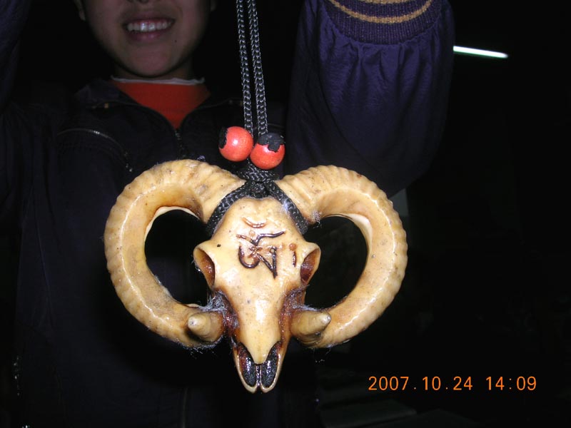 我有一个装饰品,是一个羊头。也不知道是哪来的。开始,我看到它,心里比较害怕,因为它长的有些恐怖。不过,听妈妈说,它是一种特有的石头做的,很牢固。羊角很长,有弯曲的地方。整体部分是淡黄色,眼紧眼睛和嘴巴的颜色是棕色。