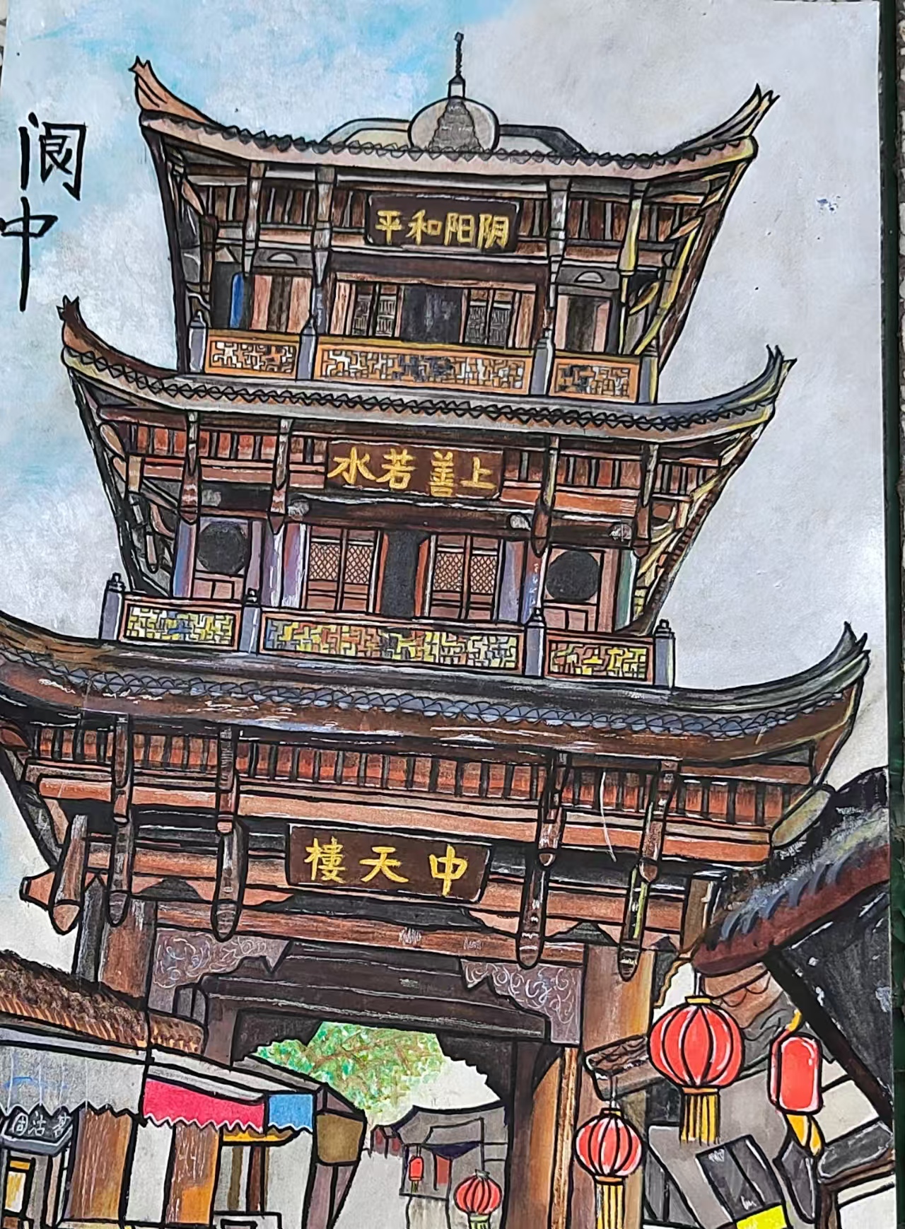 中天楼是四川阆中古城一个著名的建筑。它是阆中古城的风水坐标。古城街道以其为轴心,呈"天心十道"向四面八方次第展开,每层楼檐下,都悬挂着许多匾额,如"上善若水"阴阳平和"等,这些匾额彰显了古城深厚的文化底蕴。
