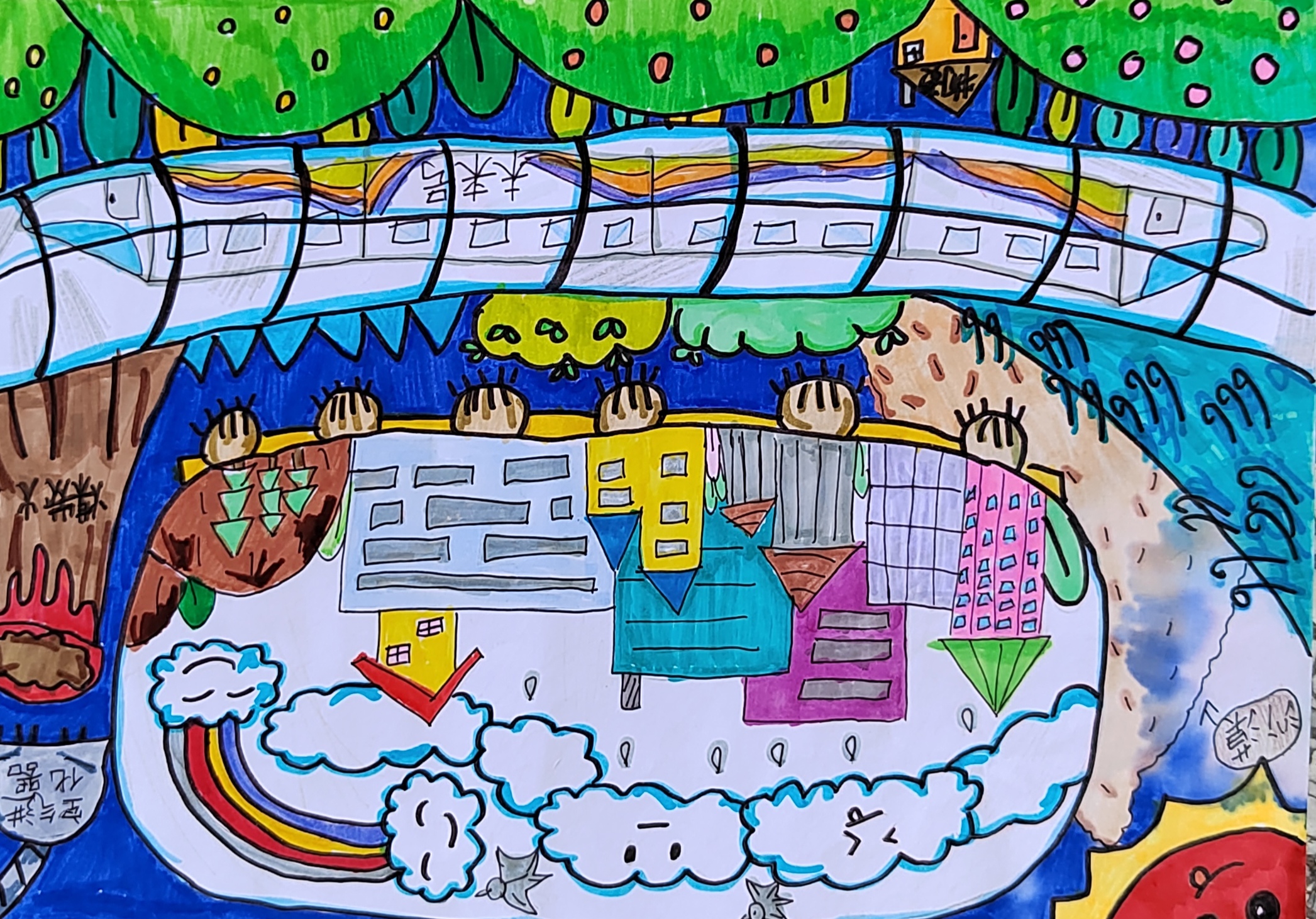 未来城市是个与外界完全隔离,悬在半空中的。这里空气全部经过空气净化器净化,特别新鲜,由于是悬在半空,地震、、洪水、战争……对它没有任何影响。高铁火车也是架在半空,人们出行方便极了。那时候,人们过着无忧无虑的舒服而又和谐的生活,可以说是未来人们的天堂。