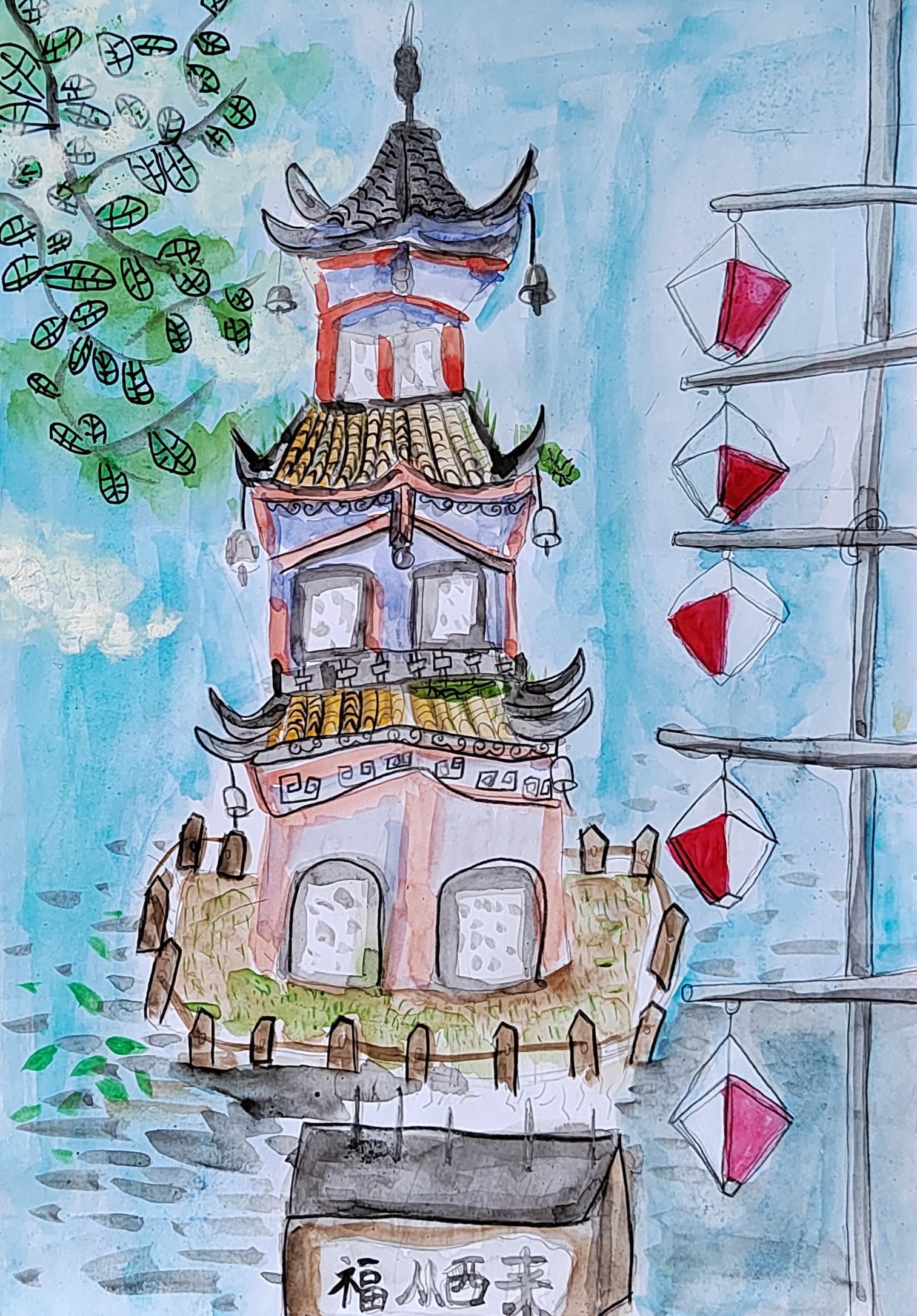 西来古镇是我的家乡——蒲江县的一个千年古镇。古镇上有一座文峰塔,它位于古镇形如行船的船头位置,高约20米,分着3层,外加宝顶。在它的上面刻着这样的诗句:"临溪之山清且幽,临溪之水碧如油。"古塔取名"文峰塔"寓意"文峰昌运",象征古镇人民幸福安康、古镇经济文化繁荣昌盛。