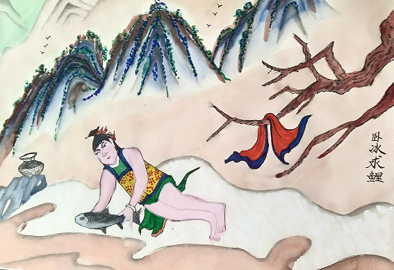 西晋初年,琅琊郡的冬日,风如利刃,肆意切割着世间的温暖。王祥家中,土坯房的窗棂被吹得哐当作响,继母朱氏卧于病榻,面色苍白如纸,气息微弱。 王祥轻手轻脚走进屋内,手中的药碗冒着袅袅热气。他轻声唤道:"娘,该喝药了。"朱氏却突然抬手,打翻药碗,嘶哑着嗓子喊道:"我要吃鲤鱼,鲜活的鲤鱼!"药汁溅在王祥手背上,烫出一片红痕,他默默擦拭,想起生母临终时的叮嘱:"待继母如亲娘……"王祥卧冰求鱼。。。。。。。 "卧冰非为鲤,孝心自通天。寒霜不足惧,春晖暖千年 。"王祥的孝行,如同永不熄灭的火焰,照亮了那个冰冷的时代,也成为后世传颂的至孝典范 。