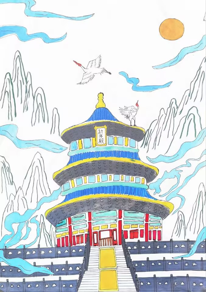 大家好!我画的是《美丽的天坛》。天坛在北京,是特别有名的地方。你看它的建筑多漂亮呀,层层叠叠的,颜色也很鲜艳。天空中有白鹤飞过,周围还有连绵的山和好看的云彩。要是有机会,我真想去天坛看看,亲身感受它的美,也希望大家能去北京旅游,看看这美丽的天坛!