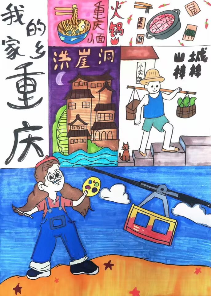 大家好!我画的是《魅力重庆欢迎你》。重庆可好玩啦,有好吃的重庆小面、火锅,还有超美的洪崖洞,晚上灯光一亮,像童话里的城堡。还有山城棒棒,他们力气可大啦。江上还有缆车,坐着能看漂亮的江景。重庆又美又有趣,欢迎大家来重庆旅游,体验不一样的风土人情!