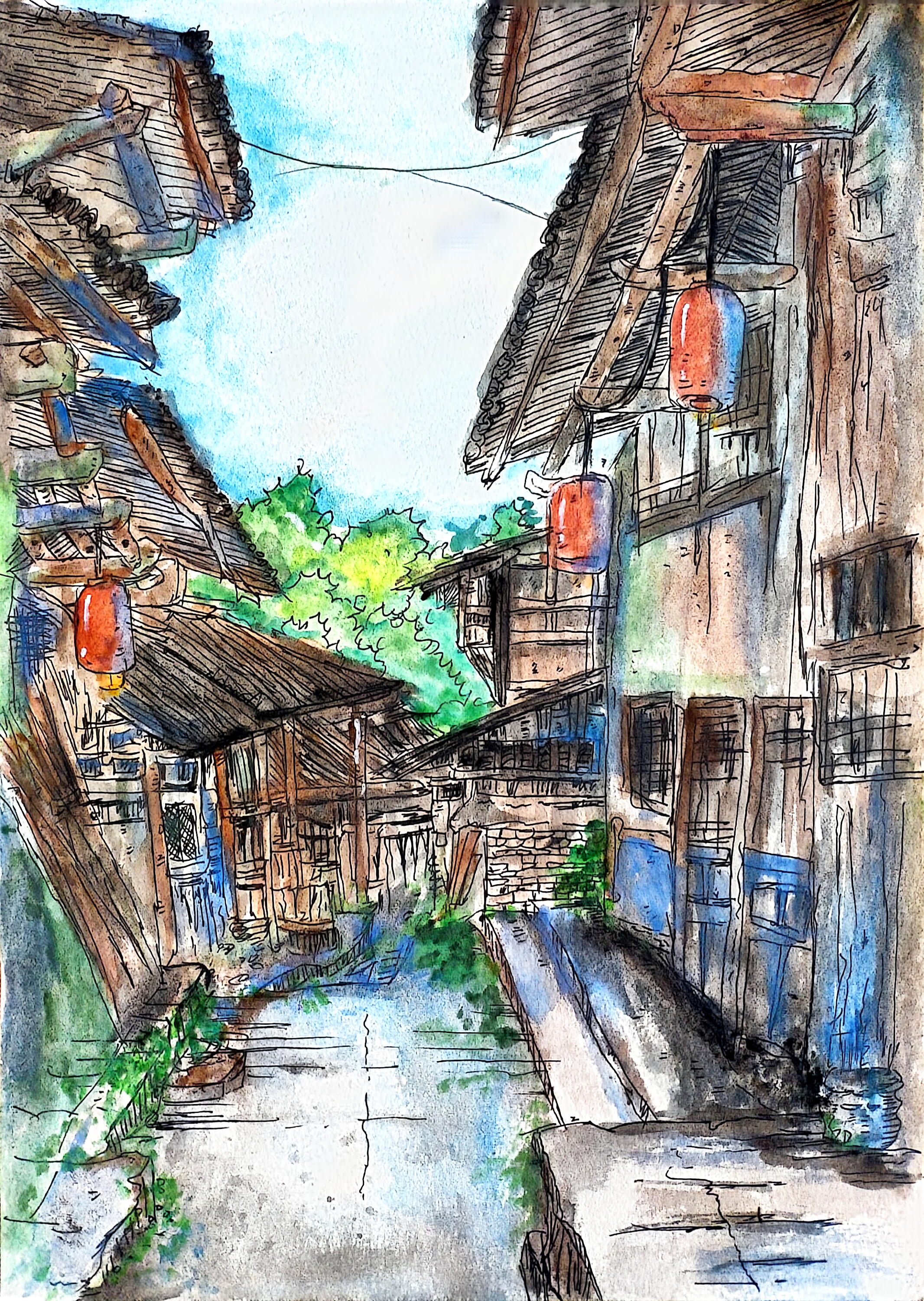 望鱼古镇是昔日茶马古道的重要驿站,绘画通过描绘青石板路,木质结构青瓦房,吊脚楼等建筑元素,运用古朴的色调和细腻的笔触,展现历史沧桑;古镇依山傍水,选址体现中国传统的风水观念,云雾缭绕的古镇景致展现自然与人文的和谐共生,望鱼古镇如同一颗璀璨的明珠镶嵌在周公河畔,这里不仅是南方丝绸之路的重要驿站,更是一个充满传说故事的古镇。