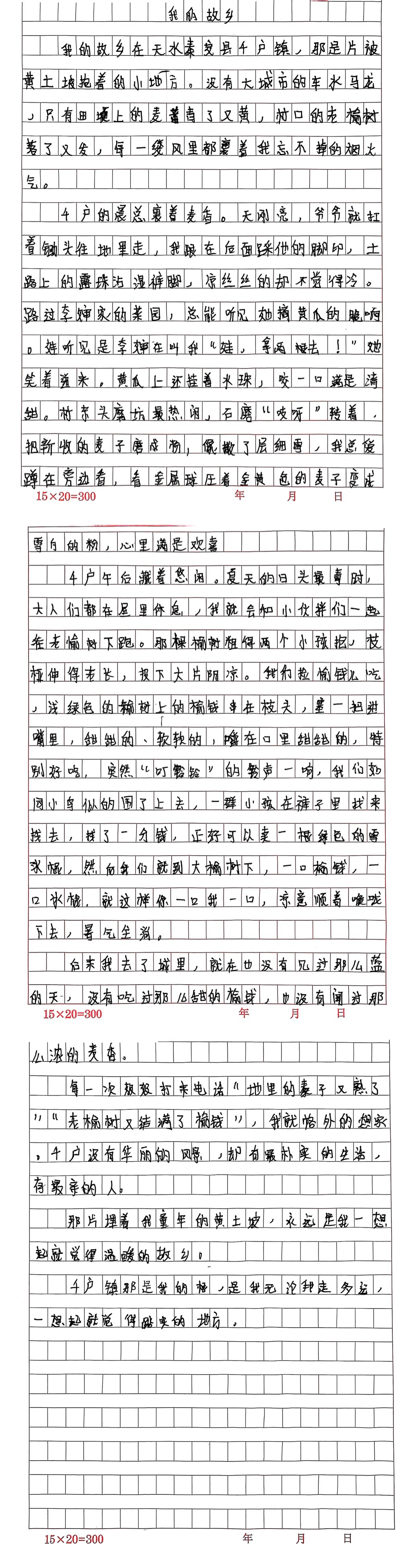 我写《我的家乡》,是想定格千户镇黄土坡里的朴素暖意:麦香裹着的清晨、李婶递来的带露黄瓜、老榆树下甜软的榆钱,这些日常细碎是我童年最鲜活的底色。我不想用华丽辞藻,只以真切的记忆,还原故乡“没有车水马龙,却有最亲的人”的模样——哪怕身处城市,那片黄土坡的麦香、榆钱甜,始终是我心里最暖的根。我想让这些烟火气,成为故乡在文字里的温柔注脚。
