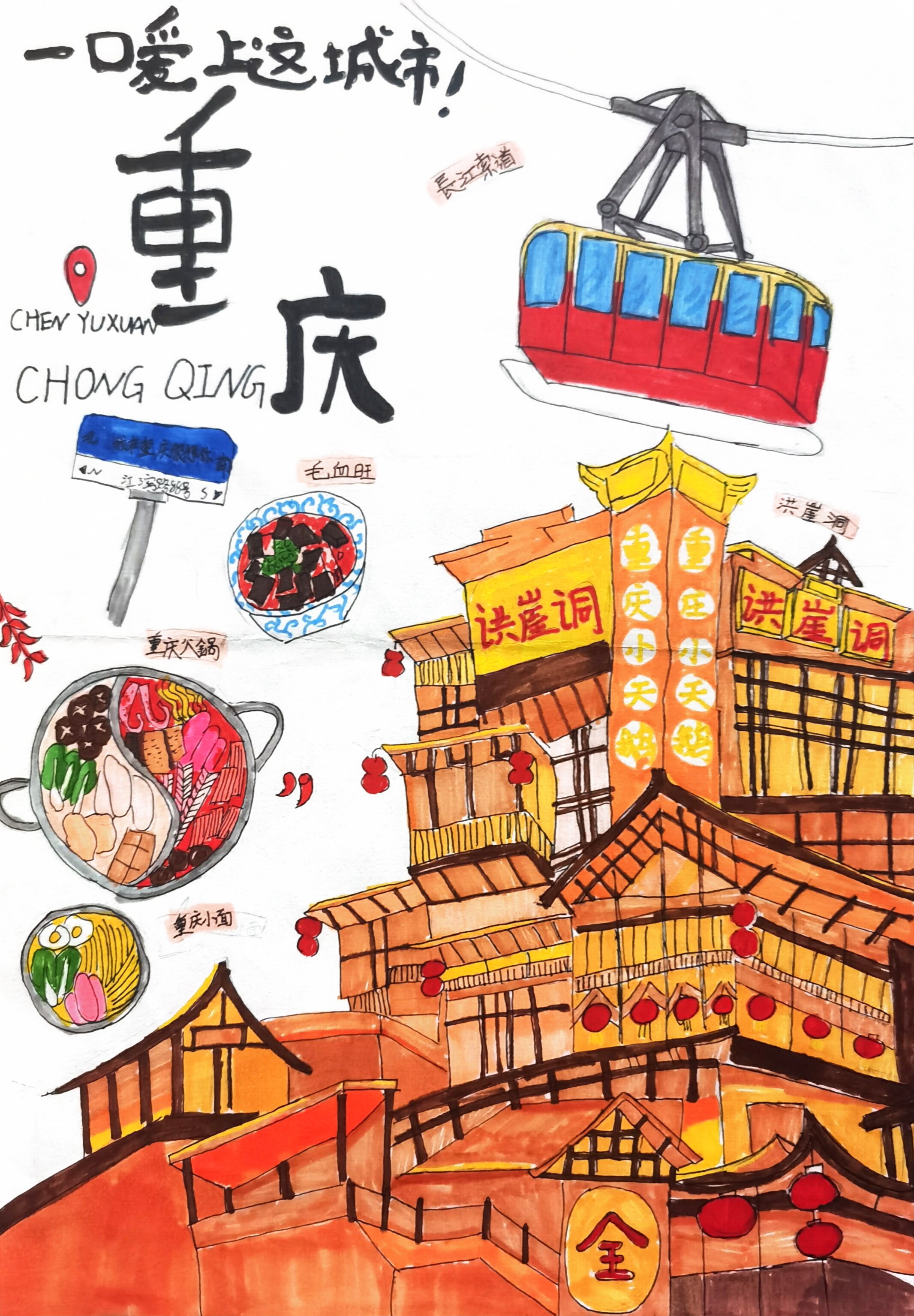大家好!我画的是《重庆的魔幻旅游乐园》。重庆可好玩啦,有洪崖洞像童话城堡,还有长江索道像空中巴士。重庆的火锅、小面、毛血旺特别好吃,辣得特别过瘾。来重庆旅游,能坐索道看风景,逛洪崖洞吃美食。重庆就像个魔幻的乐园,希望大家来重庆,体验这些超有趣的特色,玩得开开心心!