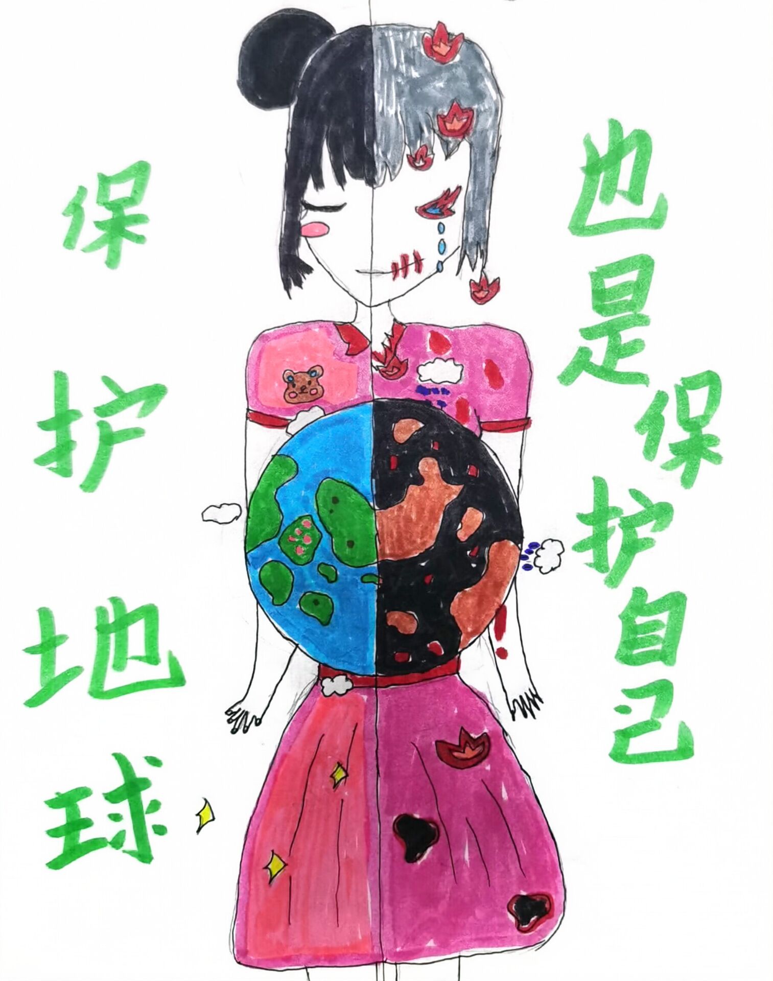 大家好!我画的是《保护地球生态就是保护自己》。你看左边的地球多美丽,右边的却受伤了。保护生态环境很重要,要是地球不好了,我们也会难过。我们要节约用电用水,不乱扔垃圾,多植树。这样地球才能一直美美的,我们也能生活得开开心心。大家一起行动,保护地球生态,就是保护我们自己哦!