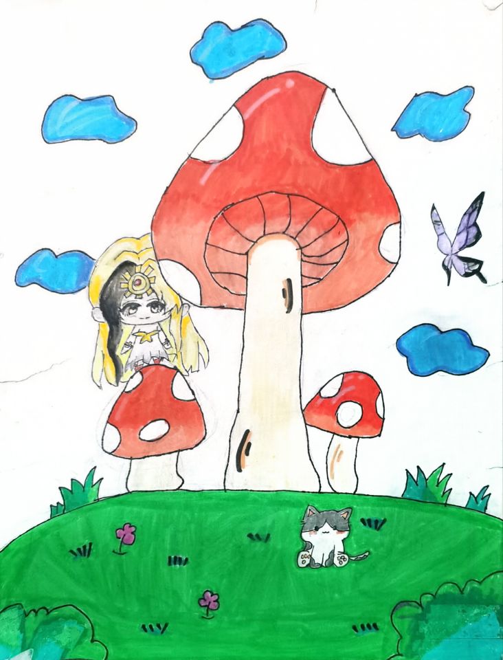 大家好!我画的是《蘑菇乐园生态保护记》。你看这儿的蘑菇多可爱,小草绿油油,还有小猫和蝴蝶在玩耍。这些都是生态环境好的表现哦。我们要保护好这样的地方,不乱摘蘑菇,不伤害小动物,让它们一直开开心心生活。大家一起行动,保护生态,就能留住这么美的乐园啦!