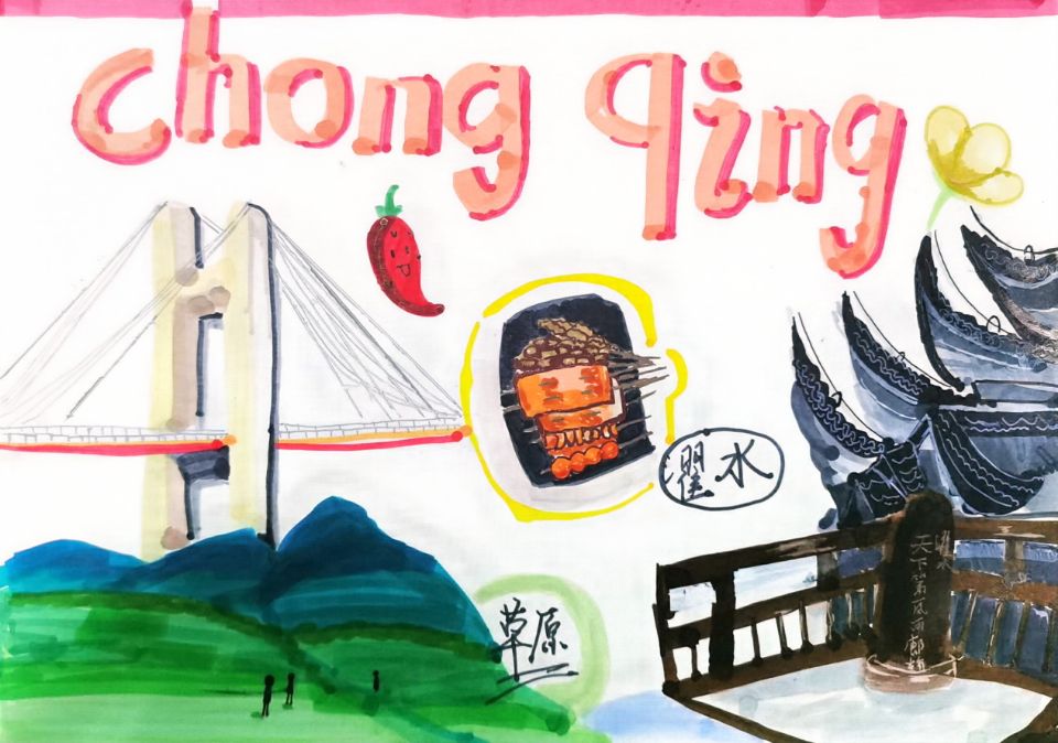 大家好!我画的是《重庆家乡美景欢乐图》。重庆是 "桥都",大桥一座比一座壮观;仙女山的草原绿绿的,像块大绿毯;濯水河的风景古色古香,超有韵味。还有香喷喷的烤串和红红的辣椒,好吃到停不下来。重庆的美景美食太多啦,每次想到这些,就觉得家乡超棒。欢迎大家来重庆,看看桥都的桥,逛逛仙女山草原,游游濯水河,尝尝烤串,保证你们玩得吃得多开心!