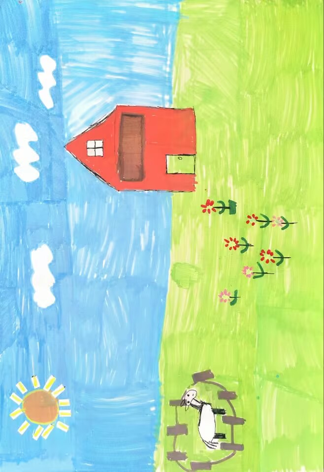 大家好!我画的是《阳光农场欢乐地》。你看,太阳亮亮的,农场里的红房子超显眼,小羊在围栏里乖乖的,草地上的小花五颜六色。在这里,每天都能看到蓝天、白云,和小羊一起玩耍。欢迎大家来这阳光农场玩,看看红房子,喂喂小羊,保证你们会爱上这片充满欢乐的农场哦!