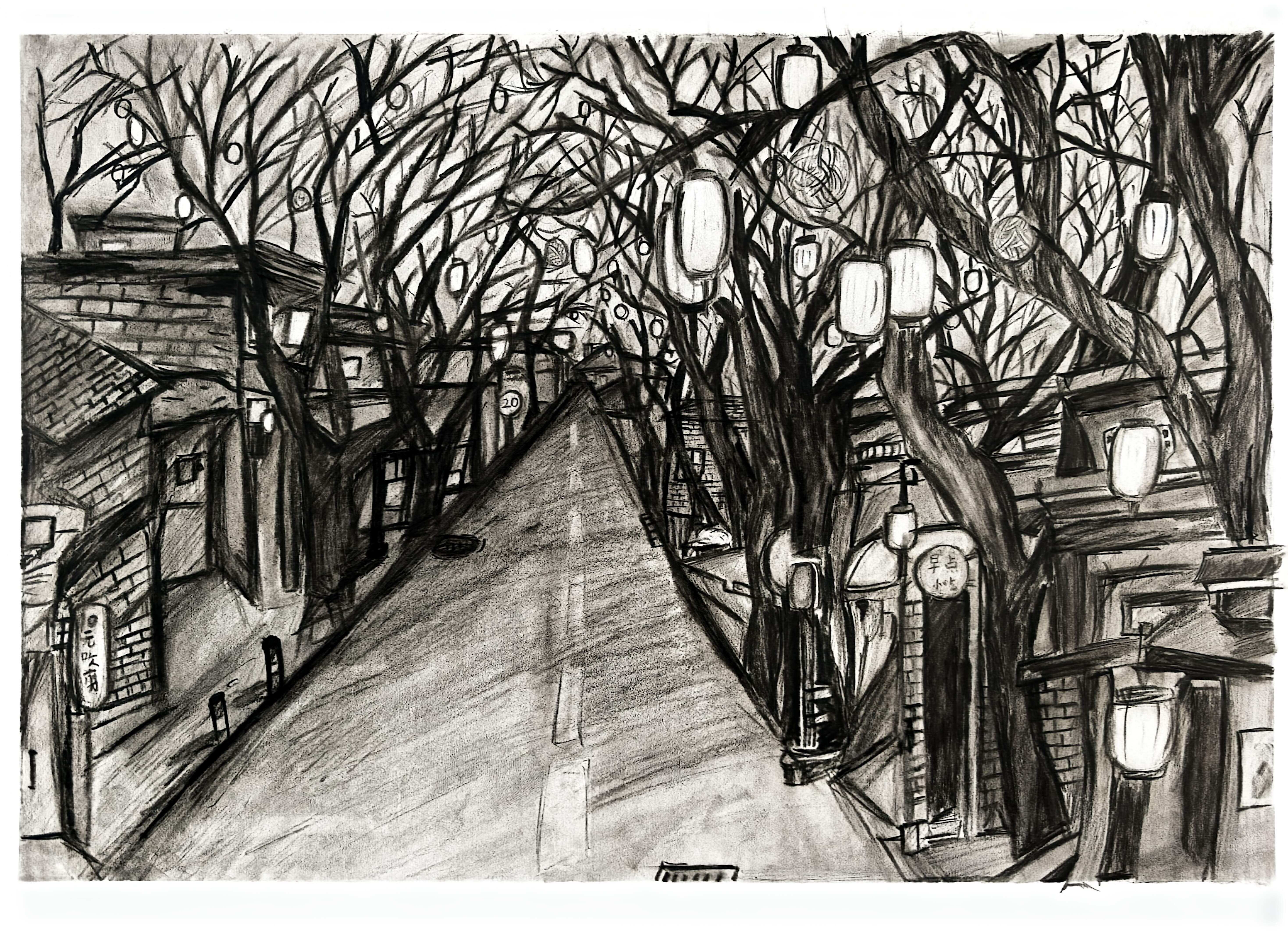 小画家想通过炭笔素描的形式,捕捉老巷子在年节时的独特韵味。意在展现老巷的古朴风貌,借满枝的灯笼传递出浓厚的年味,唤起人们对古老街巷年俗的记忆。同时以黑白灰的色调和写实的笔触,留存这份蕴含历史烟火气与传统年节温情的老巷景致,让观赏者在画面中感受老巷里的年味温度与地域文化底蕴。