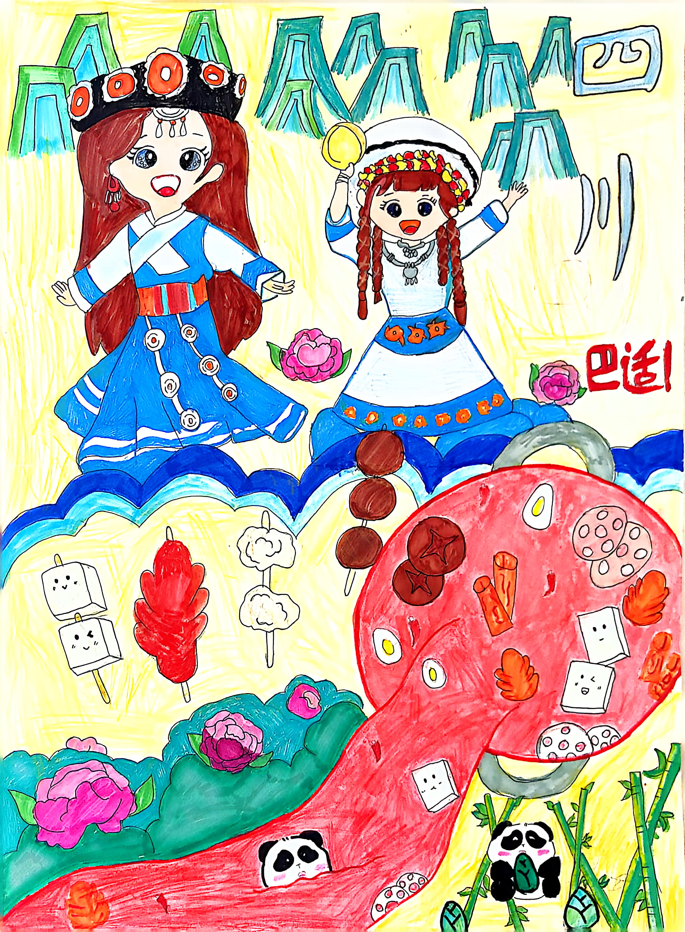 这幅画作将民族风情与科技活力巧妙相融:画面中央,两名身着民族服装的姑娘笑意盈盈,服饰细节鲜活 —— 或缀着亮片银饰,或绣着彩纹图腾,裙摆轻扬间满是灵动。 背景里,科技元素格外醒目:银灰色高铁正驰骋向前,流线型车身透着现代感;不远处,火箭直指蓝天,箭身纹路清晰可见。暖亮笔触勾勒出姑娘们的热情笑容,让民族风情的柔美与科技发展的刚劲相映,既显文化之韵,又彰时代活力,满是对美好时代的生动诠释。