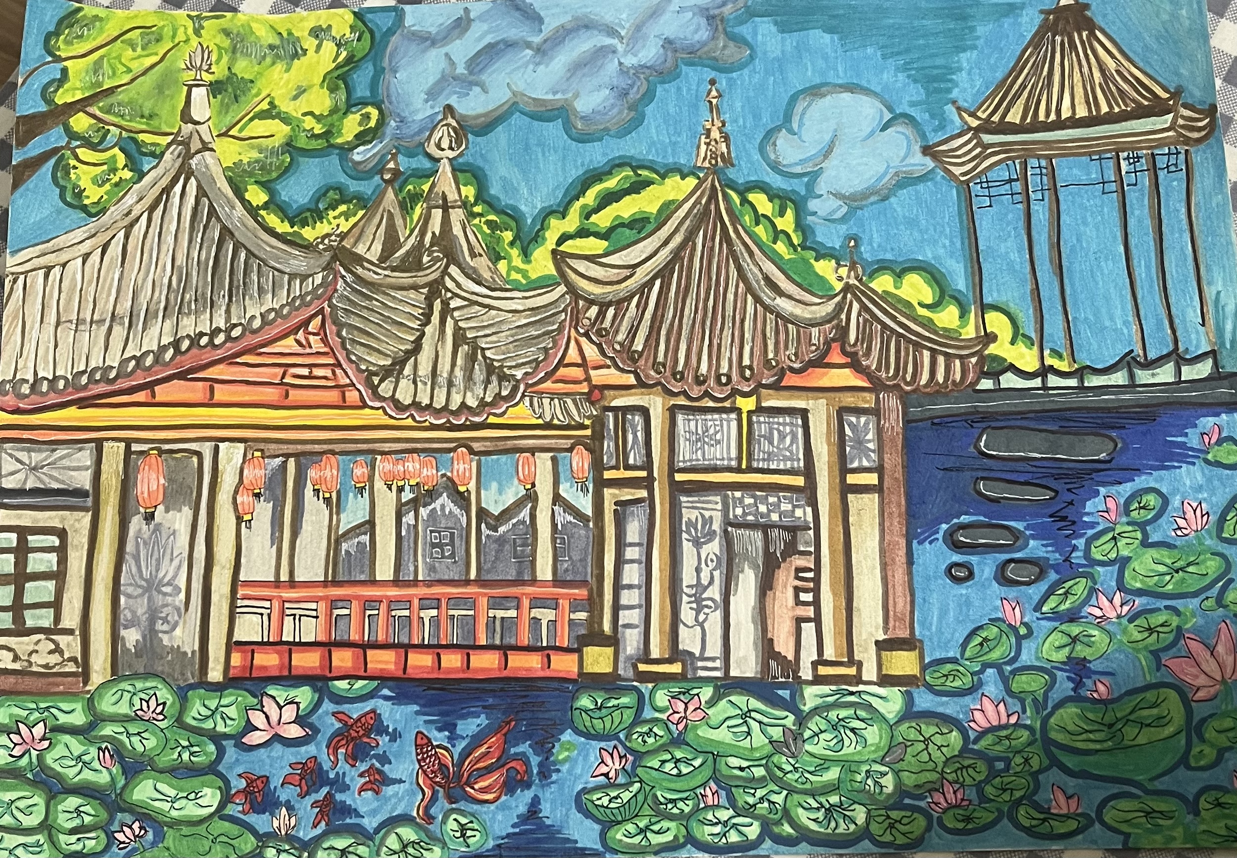 打破古典园林的素雅色调,让古老园林在色彩碰撞中焕发新生。一方面,传递中国传统文化中对自然和谐、秩序美学的追求;另一方面,用大胆的色彩对比与平面化的表现手法,契合当代受众对"视觉冲击感"艺术个性化"的审美偏好,实现"古典意境"与"现代审美"的双向共鸣,让观者既能感受到东方园林的文化底蕴,又能被现代艺术的活力感染。在细节上,刻画建筑的木构纹理、荷叶的脉络、锦鲤的动态,用线条的粗细变化强化质感;引导视线流动,让画面在丰富中不失秩序,在传统中彰显创新。