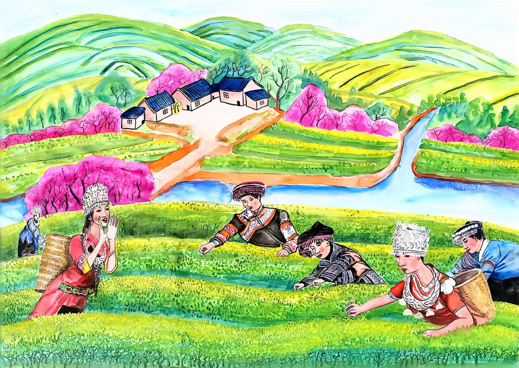 作品以凤冈独特的自然禀赋与人文劳作為核心,聚焦 "锌硒茶" 这一地域瑰宝 —— 凤冈土地富含锌硒元素,孕育出生态有机的锌硒茶,茶汤清冽、滋味醇厚。 画面主体展现家乡劳动人民的采摘场景:春日晨露未晞时,茶农们挎着竹篓穿梭茶园,指尖轻捻嫩芽,腰背微弓间满是专注,汗水滴落土壤却笑意挂在眉梢,每一个动作都透着对茶的珍视与劳作的热忱。 通过捕捉这一鲜活的劳动瞬间,既凸显锌硒茶的天然品质,更歌颂人民的勤劳本色,让 "劳动最伟大、劳动最崇高、劳动最美丽、劳动最光荣" 的理念融入每一片茶叶,传递对家乡土地与劳动者的深深敬意。