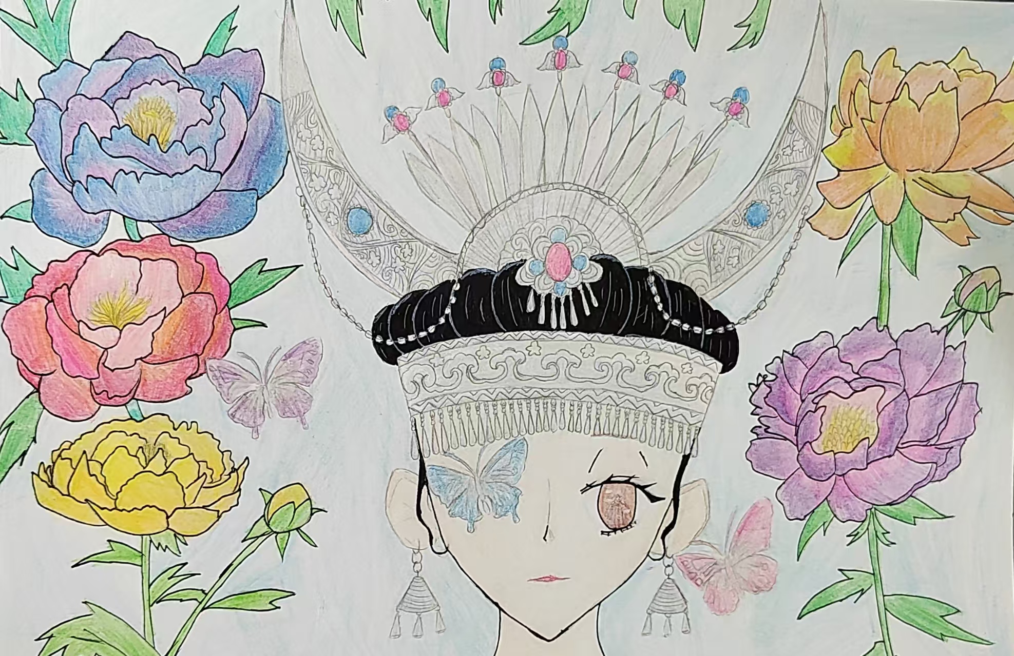 苗族银帽非常好看。我暑假里去旅游,第一眼就爱上了它。它是苗族盛装头饰,由众多的银花及各种造型的鸟、蝶、动物和银键入银铃组成,给人以满头珠翠、雍容华贵的印象。它分内外两层。内层用缠布铁丝编成适于顶戴的帽圈,外层分三段,上段为帽顶,通冠由成百上干的银花组成,帽顶正中,银扇高耸。中段帽箍为压花银片,上有二龙戏珠纹样,两侧有孩童嬉戏形象。下段沿帽箍垂下一排吊穗,皆以银链相连,银铃叮当。