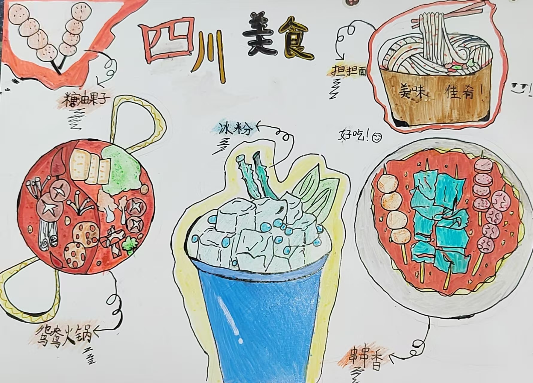 在我的家乡四川,有许多美食,比如:糖油果子,担担面,冰粉,鸳鸯火锅,串串香。其中我最喜欢吃的是鸳鸯火锅,这种火锅分为两种口味,一个是红汤,一个是清汤。把你喜欢吃的素材放到自己喜欢口味的锅里去煮,煮熟以后就可以吃了。