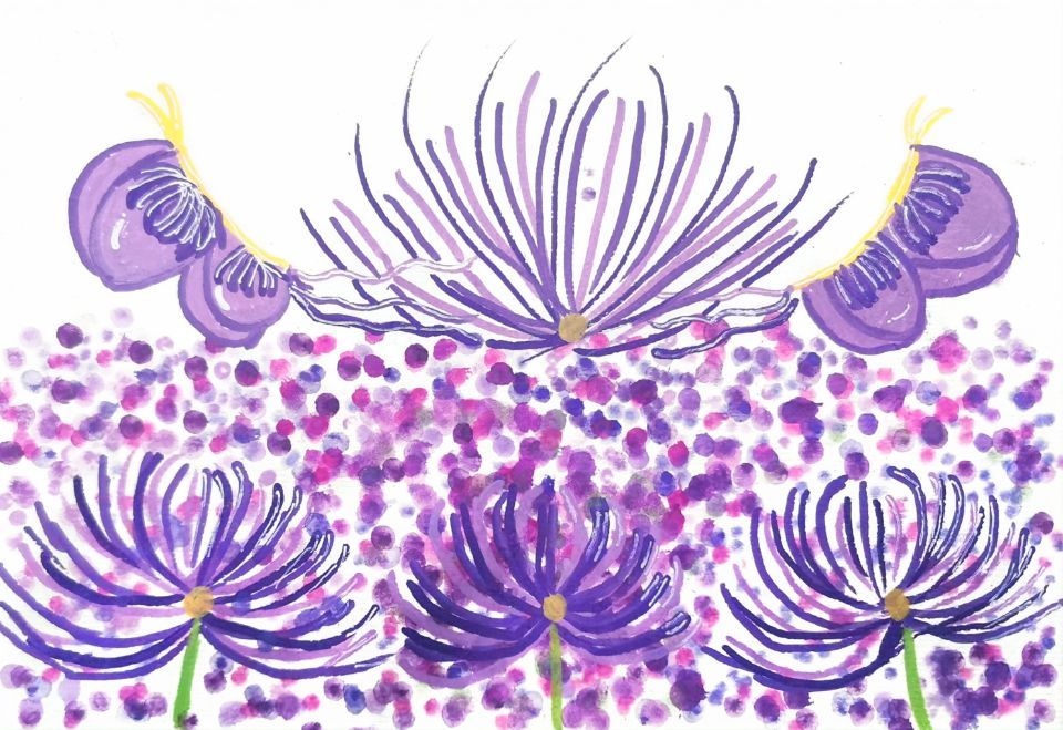 大家好!我画的是《紫色花舞梦幻花园》。你看,满是紫色的花儿在跳舞,有的像烟花,有的像蝴蝶,背景还有好多彩色的小圆点,像撒了一把糖果。这花园就像童话里的秘境,走进去感觉自己要变成花仙子啦。我们要爱护花草,不摘花、不踩草,让花儿一直开得这么美。欢迎大家来紫色花舞梦幻花园,一起在花海里做甜甜的梦哦!