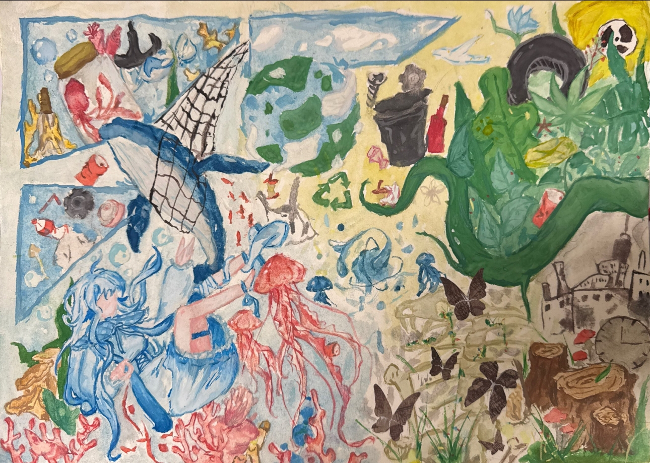 海洋,覆盖地球71%的表面积,是生命的起源之地、气候的调节器、资源的宝库。它孕育了万千生灵,为人类提供氧气、食物与航运通道,却正面临着塑料污染、过度捕捞、海水酸化等多重危机。保护海洋生态,不仅是守护海洋生物的家园,更是守护人类自身的生存根基。海洋里生物与渔网,垃圾纠葛,森林间砍伐与生机并存,地球与回收符号的存在,是警示人类活动对自然的反噬。人类应该以敬畏之心守护生态,让地球重归和谐共生之态。
