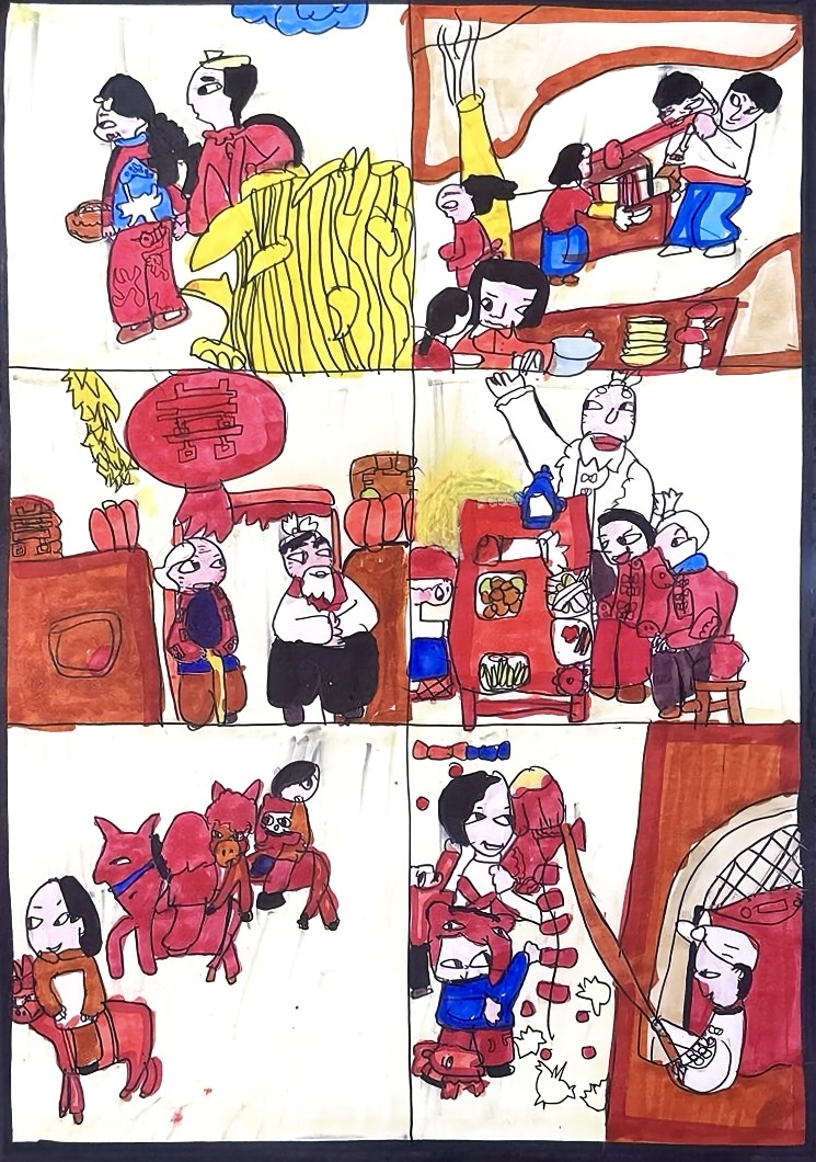这幅画用分镜式画面,还原了陕北民俗里的"红火喜事儿":从丰收的黄米堆、窑洞灶台的热乎饭,到贴"囍"字的嫁娶场景、骑红马的迎亲队伍,再到孩童耍社火、放鞭炮的热闹,全是陕北窑洞院里的年俗底色。陕北的喜事儿总裹着黄土高原的热乎劲儿——黄米、窑洞、红妆、社火,这些元素藏着老陕对生活的热望,这幅画用鲜活的色块,把陕北"红火火、热热闹"的民俗烟火,画成了看得见的生活温度。