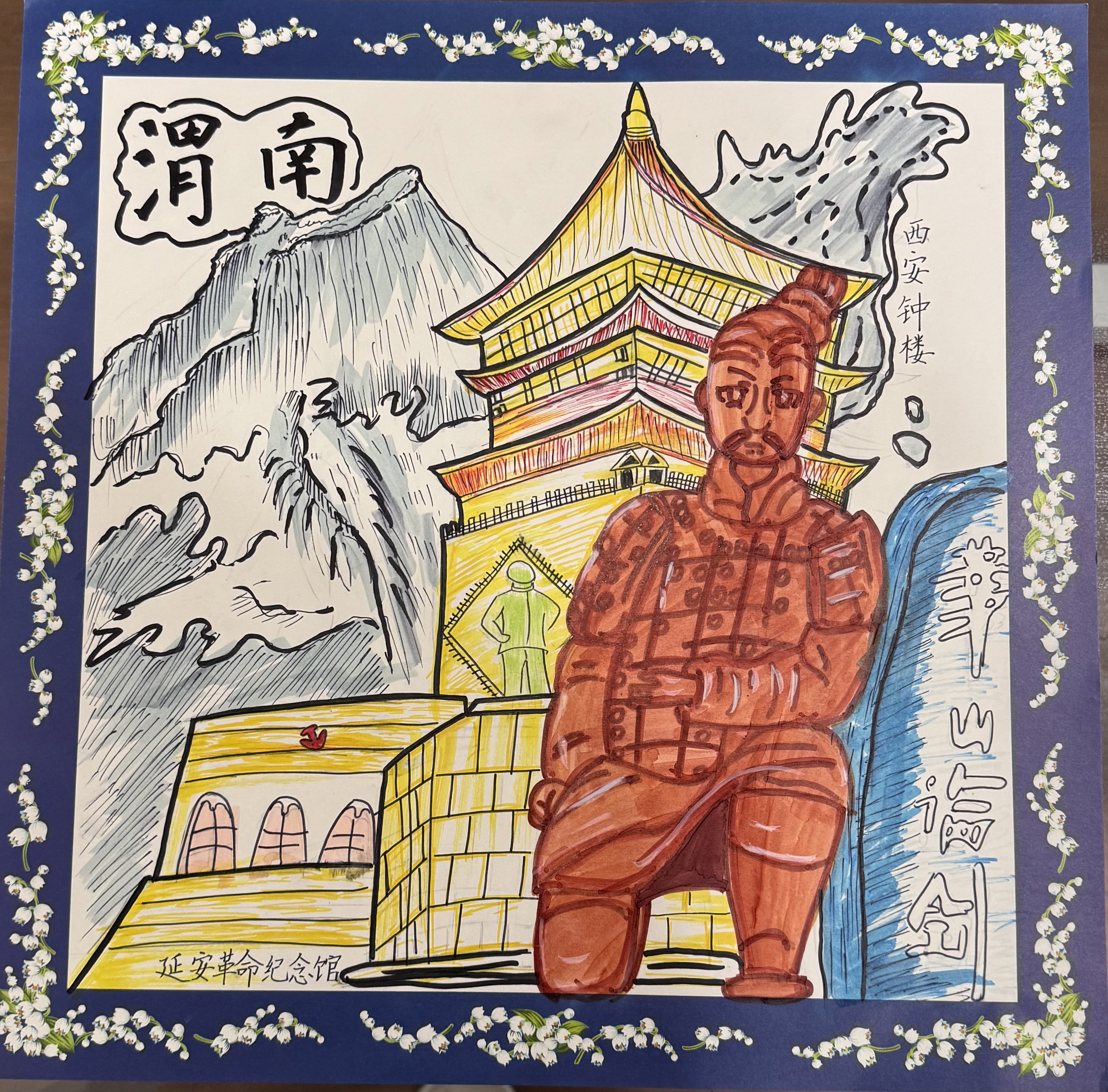 这幅画以陕西渭南为核心纽带,将三秦大地的"历史、自然、红色"三重基因融于一图:画面中的兵马俑,是西安临潼"世界第八大奇迹"的秦汉雄风;侧畔的"华山论剑",是渭南华阴"奇险天下第一山"的自然风骨;背景里的西安钟楼,承载着古都长安的盛唐气韵;而延安革命纪念馆,则烙印着红色圣地的精神底色。它以渭南为"锚点",串联起陕西从周秦汉唐到革命年代的文明脉络——既是"华夏之根"的地理缩影,也是三秦大地"历史厚重、山河壮阔、精神炽热"的生动凝练。