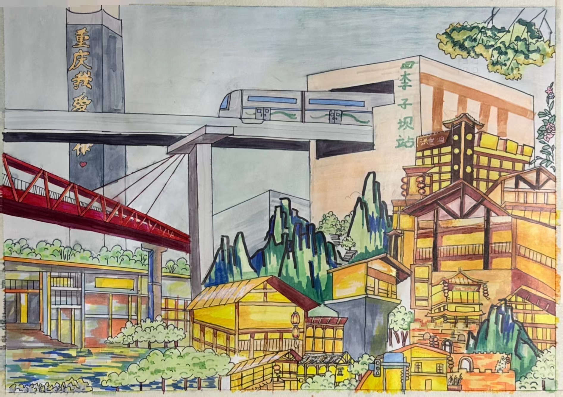 大家好!我画的是《轨行巴渝・一城风华》。你看,李子坝轻轨穿楼而过,超酷的!还有洪崖洞的吊脚楼,像童话里的城堡。重庆的山山水水和高楼大厦凑在一起,又立体又好看。重庆的轨道交通可神奇了,城市又有好多好玩好看的地方。欢迎大家来重庆,坐轻轨、逛洪崖洞,感受这座 8D 城市的独特风华哦!