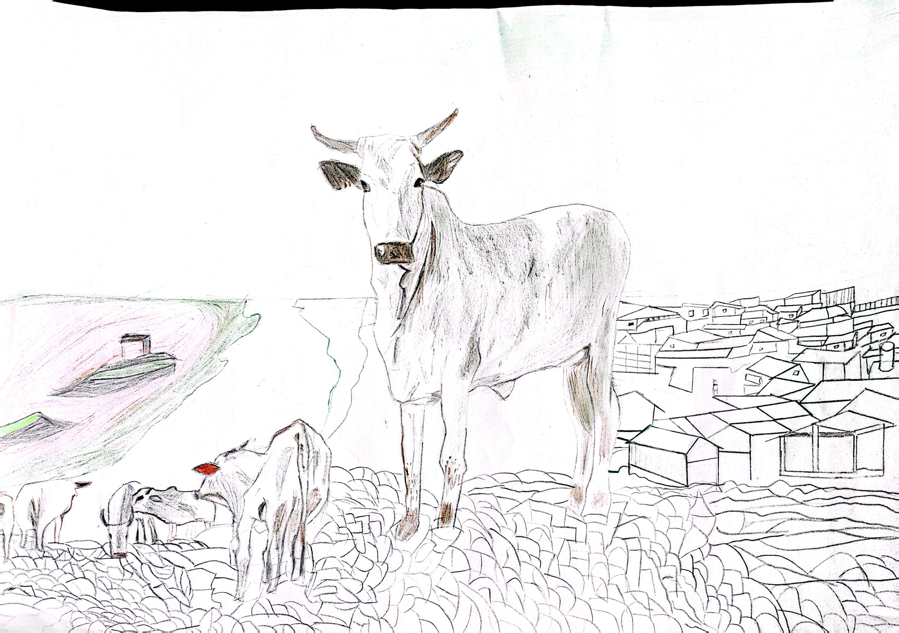 幅画以村落旁的牛群为载体,想还原乡土生活的松弛感——成年牛的沉静伫立、幼崽的亲昵互动,搭配远处的屋舍与浅滩,是我对乡野日常的具象化:没有浓烈色彩,只用素描线条铺陈草地纹理与牛的肌理,是想让观者感知这份"慢":乡野的生机从不是喧嚣的,而是生灵与烟火气共生的平和,这也是我想留住的生活本味。