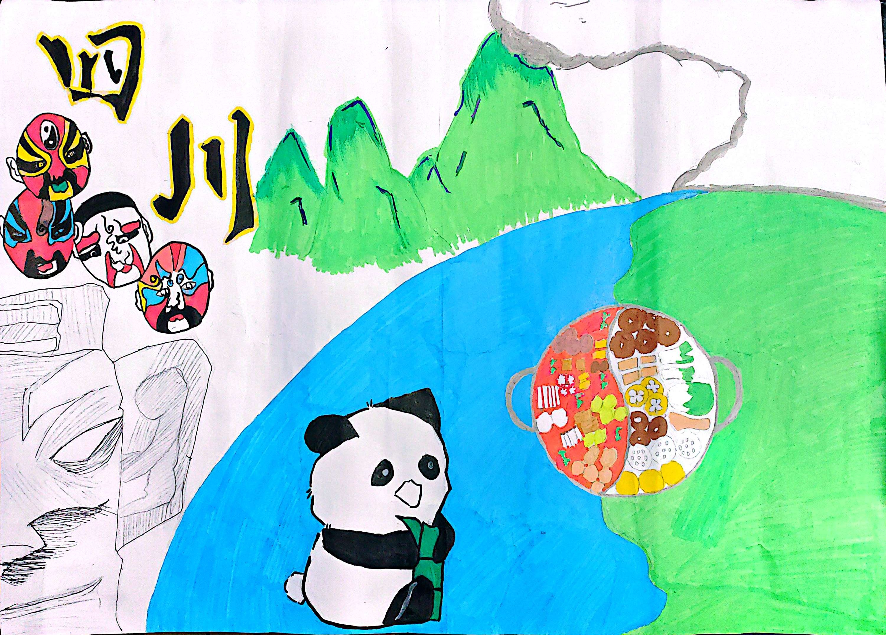 这幅画以"四川"为核心,用脸谱体现川剧文化、熊猫代表地域标识、火锅承载烟火生活,搭配青山绿水呼应四川"天府之国"的自然底色,左下角轮廓暗合三星堆元素。整体用明快色彩串联文化符号,既展现四川的自然灵秀,也传递其人文烟火气,让家乡特色在画里鲜活起来。