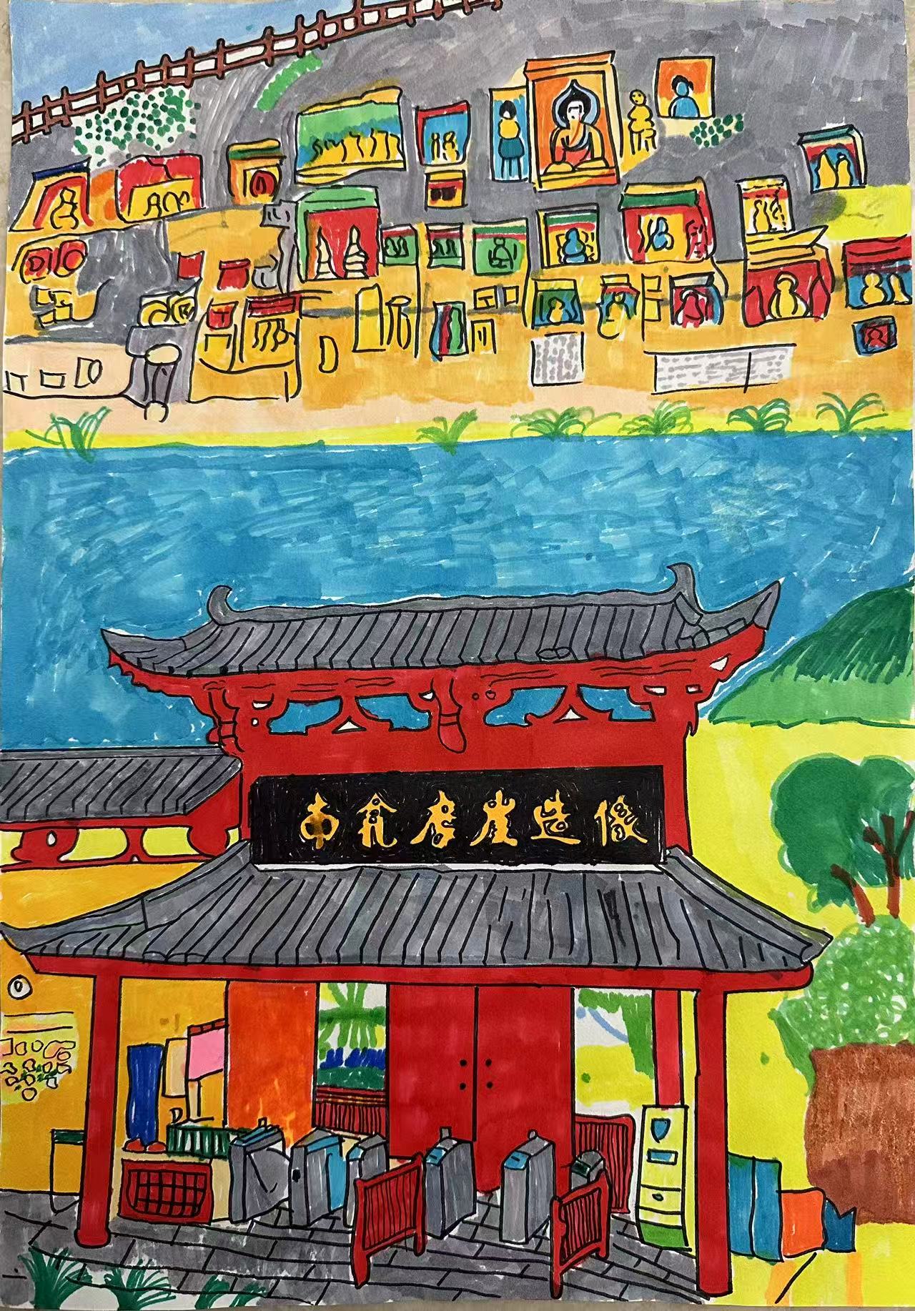 这幅画聚焦巴中文化地标——南龛摩崖造像:牌楼题字点明"南龛唐崖造像",崖壁上的佛像、浮雕还原其唐代石窟艺术风貌。作为巴中千年文化遗存,南龛造像以精美石刻承载盛唐艺术,这幅画将古建牌楼与石窟元素相融,既显其历史厚重感,也透出巴中"红色之外的文化底色"。