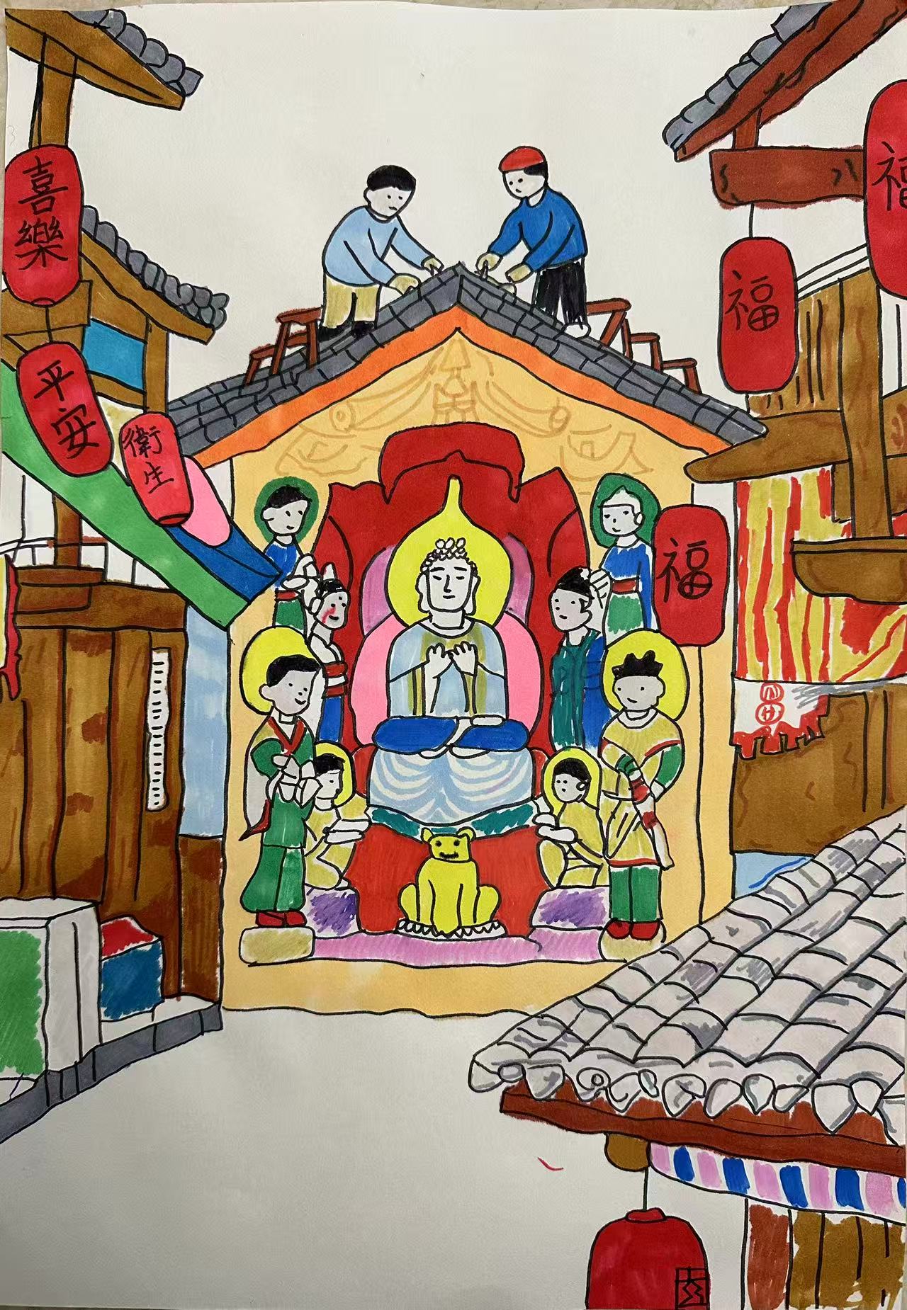 这幅画聚焦巴中文化传承:画面里的佛像造像对应南龛石窟(巴中核心文化遗存),人们修缮建筑、守护造像的场景,是当地保护文化遗产的缩影。巴中既以红色记忆闻名,也以千年石窟承载文化根脉,这幅画将市井烟火与文物守护相融,显露出城市对历史遗存的珍视与传承温度。