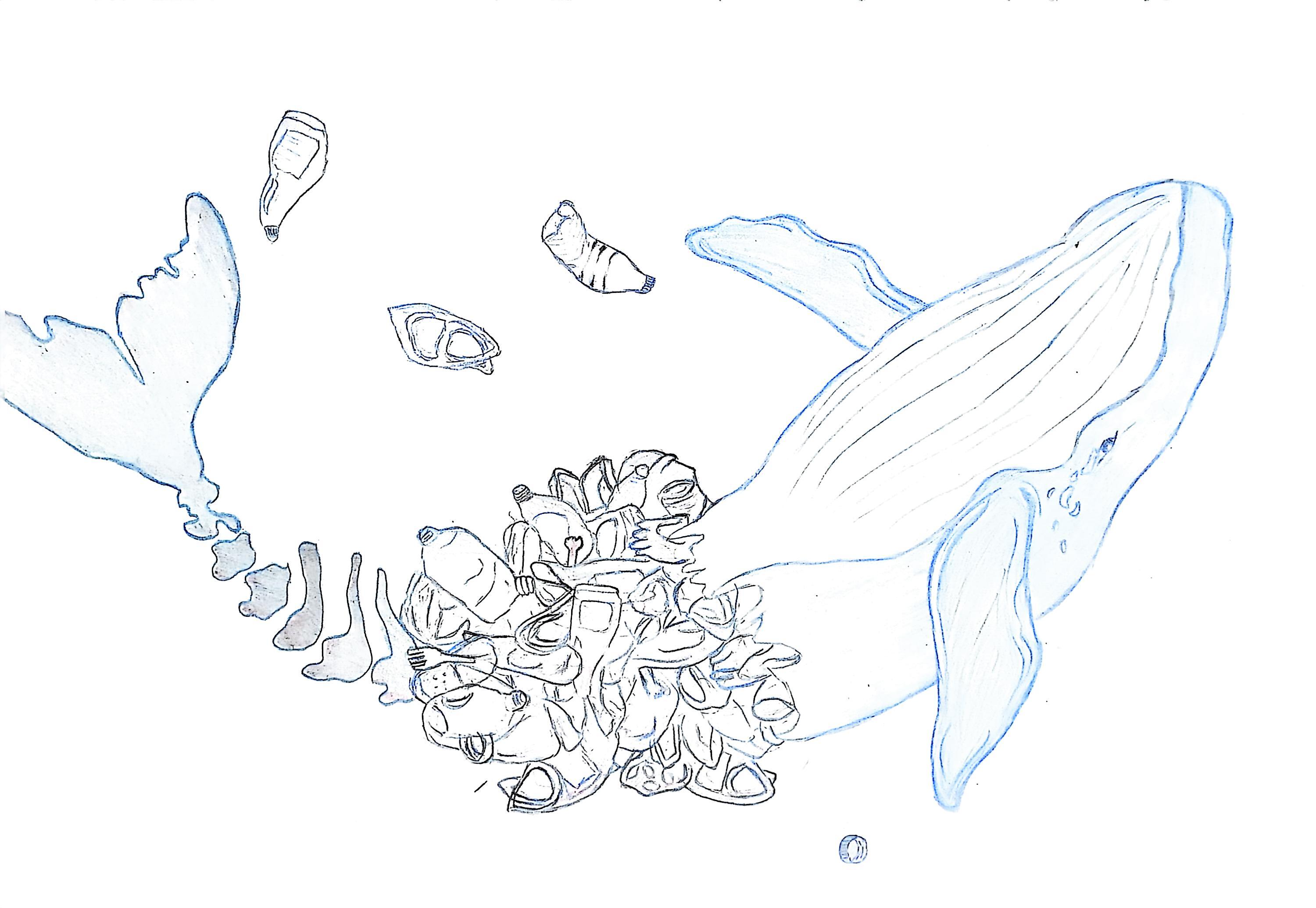 创作灵感:以垃圾拼塑鲸鱼的言身体,后方身体 为鱼骨架,每个"伤疤"都是人类会弃的残物、塑料瓶、袋,一次性餐具等.让鲸鱼成为了海洋垃圾的容器灵感头源于海洋生物被污染反噬的现实,借这天"垃圾鲸"替沉默的大海发出窒息的悲鸣,刺回叩问人类对海洋的伤害。
