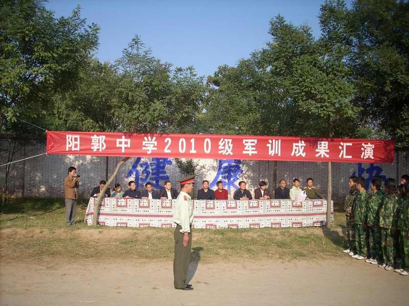 9月23日,我校高一新生军训成果汇演在我校操场隆重举行。这天一大早,老师就忙着布置会场,8点整,汇演正式举行,宋过兵校长、李现本副校长、荆建民书记、政治处田生荣主任、总务处贺学谦主任等领导和5位裁判员老师在主席台前就座。