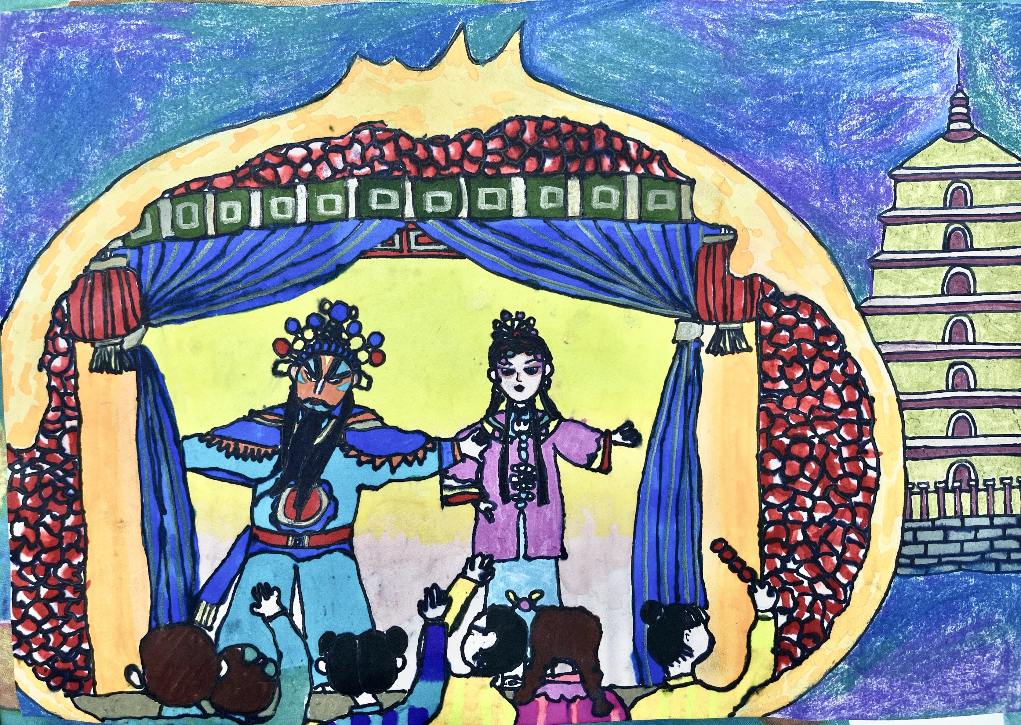 秦腔戏台之上,石榴是承载"多子多福"祈愿的鲜活符号。红果艳艳、千籽抱团的特质,与秦腔高亢热烈的基调相得益彰。角色口中"榴开百子"的唱段,借其"一果千籽"的意象,寄托对家族人丁兴旺、子孙绵延的美好向往。秦腔的粗犷感染力,让这份吉祥寓意更显真挚浓烈,成为传统婚俗、节庆类剧目中,跨越时空的文化共鸣。 作品背景以大雁塔作为长安地标,赋予美术作品历史厚重感,烘托典雅庄重的艺术氛围。