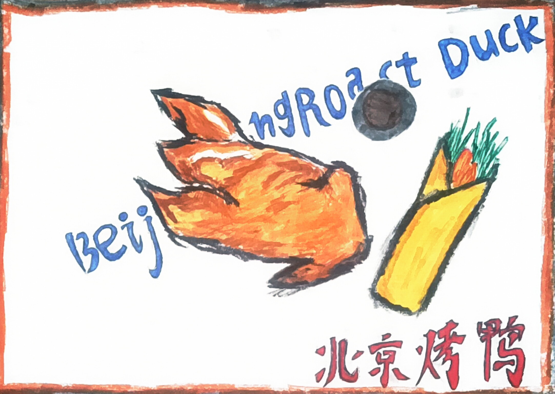 大家好!这是我画的《京味鸭香・名吃小绘》,画的就是大名鼎鼎的北京烤鸭 —— 你看这鸭皮烤得金黄金黄的,油润润的看着就特诱人,旁边卷好的鸭卷还裹着翠绿的葱丝,是这道菜的经典吃法。北京烤鸭可是咱们国家的招牌美食,算是老北京的 "美食名片" 了,听说裹上薄饼、蘸点甜面酱,一口下去又香又润。这道小吃藏着老北京的烟火气,我一直馋这口地道京味,你们有没有尝过这道有名的菜呀?