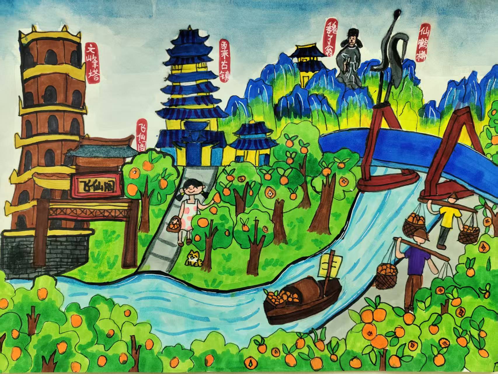 我的家乡--成都蒲江,是一座藏在川西的"山水+烟火"宝藏小城。这里既有古寺石窟的千年沉淀,也有柑橘满枝的丰收热闹。画中的文峰塔,是蒲江西来古镇的标志性古迹,青砖叠砌的塔身藏着千年文脉;旁侧的飞仙阁,正是蒲江唐代摩崖造像的秘境;中间的"古镇"对应西来古镇,青石板路、古榕树与明清民居,至今飘着市井烟火气;漫山的柑橘林更是蒲江"中国柑橘之乡"的生动写照——我们的耙耙柑、爱媛38号等柑橘,甜润多汁,是北纬30°黄金农业带里的"橙黄名片"。