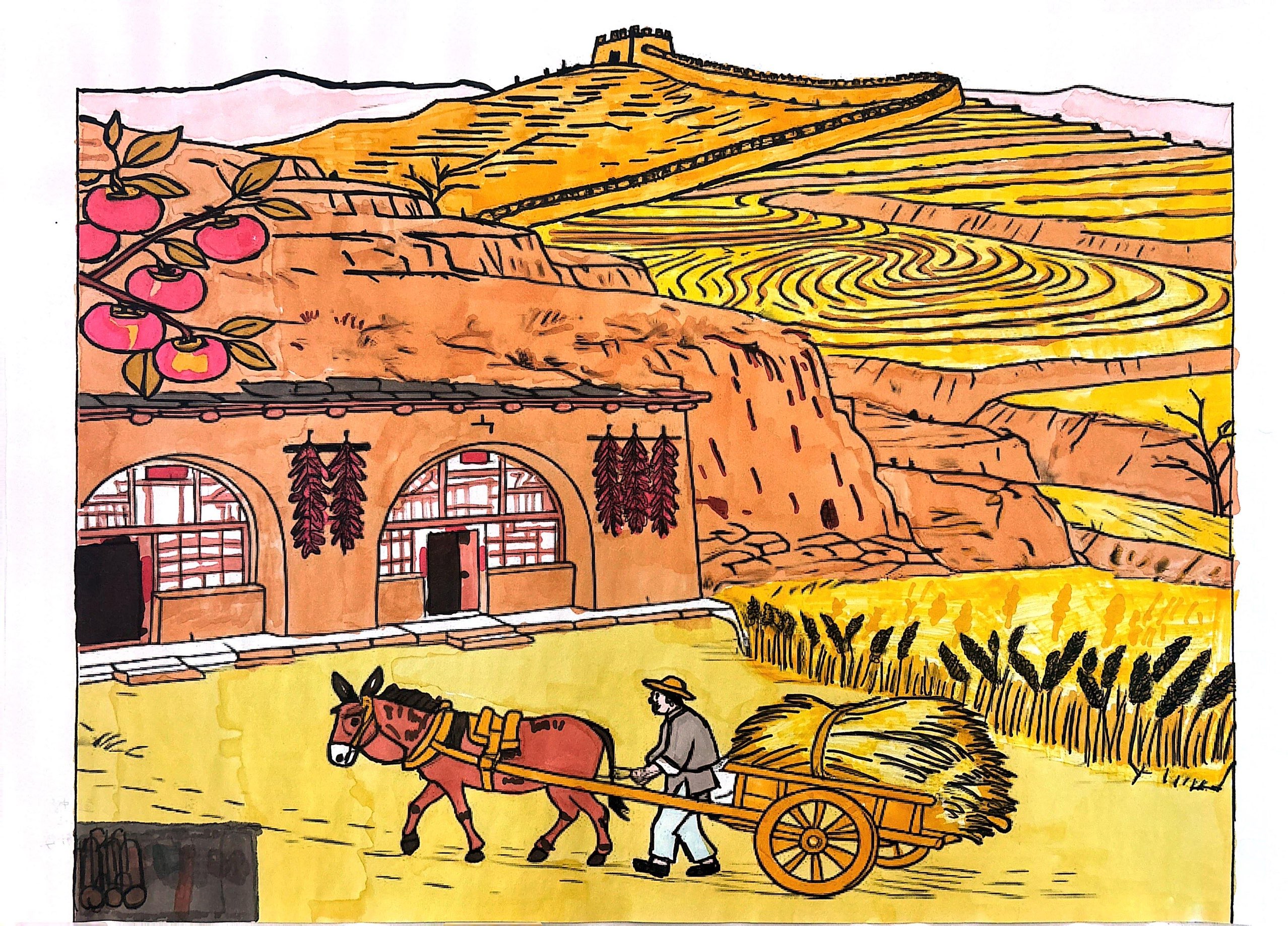 这幅作品以"黄土高原的秋日烟火"为核心,用暖色调铺就陕北地域的生活肌理:窑洞的土黄、梯田的金浪、挂满檐角的红柿与辣椒,是黄土高原秋日丰收的标志性意象;赶驴车运麦草的农人,则还原了当地质朴的劳作日常,让画面浸满生活的烟火气。 背景里的长城轮廓,是地域文化的暗线——它既锚定了陕北的地理坐标,也让"日常烟火"与"历史厚重"轻轻勾连,显露出这片土地"岁月沉淀里的鲜活"。 创作意图是"以画载情":用明快的色彩与具象的生活场景,消解黄土高原的苍凉印象,转而呈现它秋日里饱满的丰收感与温暖的生活味,让观者从窑洞、作物、劳作的细节里,触碰到这片土地独有的、踏实而热烈的烟火气息。