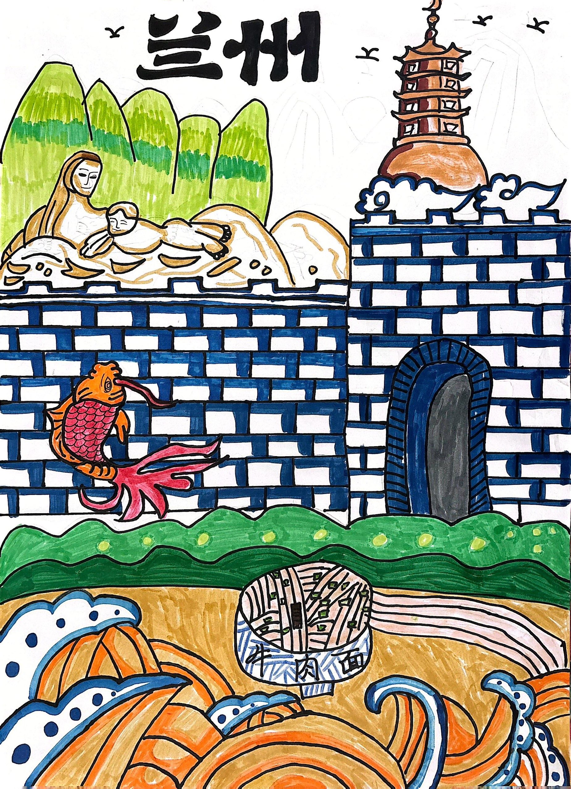 白塔的层檐是兰州的地标印记,城墙与门洞藏着丝路的历史余韵,飞天与锦鲤则揉入敦煌的艺术灵韵,底部的牛肉面更是城市的烟火底色。 色彩上以青绿、蓝白铺展山水与建筑,用暖橙、艳红提亮飞天与锦鲤,既保留传统符号的辨识度,又以童趣的色彩碰撞消解厚重感,让"历史地标"艺术符号"生活美食"在画面里共生。 把兰州的"古(城墙、白塔)、艺(飞天)、食(牛肉面)"揉进同一幅画面,让观者从飞天的飘逸、白塔的稳重、牛肉面的烟火里,摸到兰州那种"驮着丝路历史,裹着日常温度,又浸着艺术灵韵"的独特气质——它不只是一座城,更是藏在符号里的鲜活故事集。