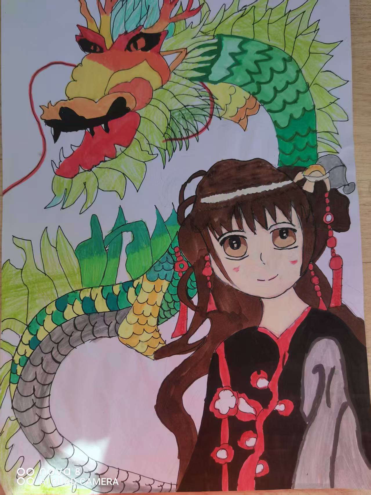 这幅画的创作,是想把 "东方传说里人与龙的温柔羁绊" 揉进色彩里:青绿鳞甲的龙像从水墨里游出来的灵,绕在穿红纹黑裙的女孩身边 —— 龙的色彩不是张扬的金,是带着草木气的青与绿,和女孩发间的红珠、裙上的花扣刚好撞出 "软乎乎的传奇感"。 我用动漫感的线条画女孩的眉眼,让她的笑和龙的温驯呼应,是想让 "龙不再是遥远的神兽,而是能轻轻靠在身边的伙伴",让看画的人能摸到那种 "人和传说贴得很近" 的暖。